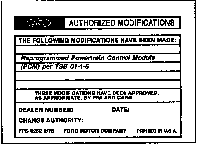 Obtain an Authorized Modifications Decal (FPS 8262 - obtainable through DOES II, 25/pkg) and list the date, dealer number, and summary of modifications performed. Select a prominent place adjacent to the Vehicle Emission Control Information Decal suitable for installing the Authorized Modifications Decal. Clean the area, install the decal, and cover it with a clear plastic decal shield.