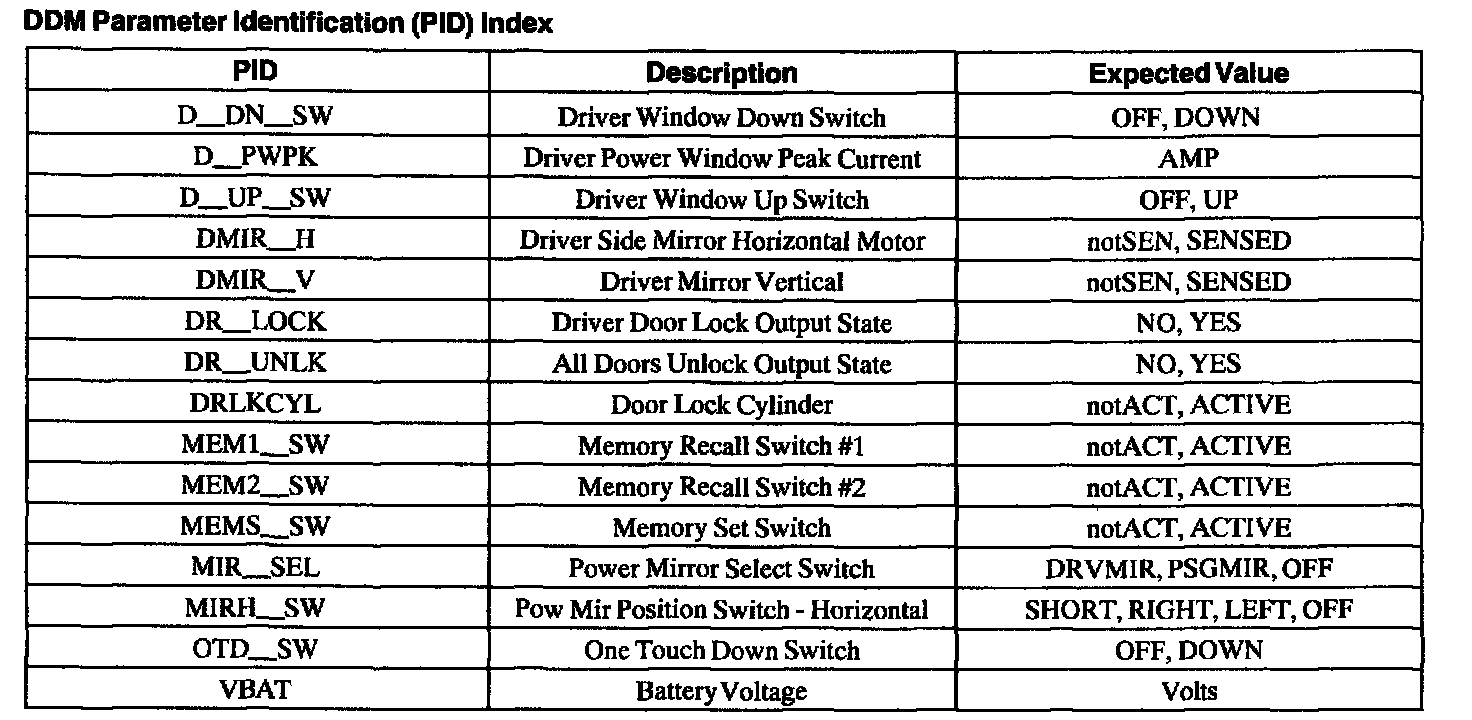 Driver Door Module (DDM) Parameter Identification (PID) Index