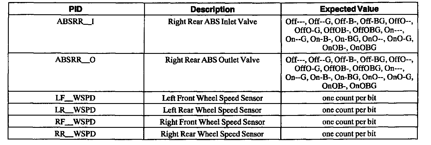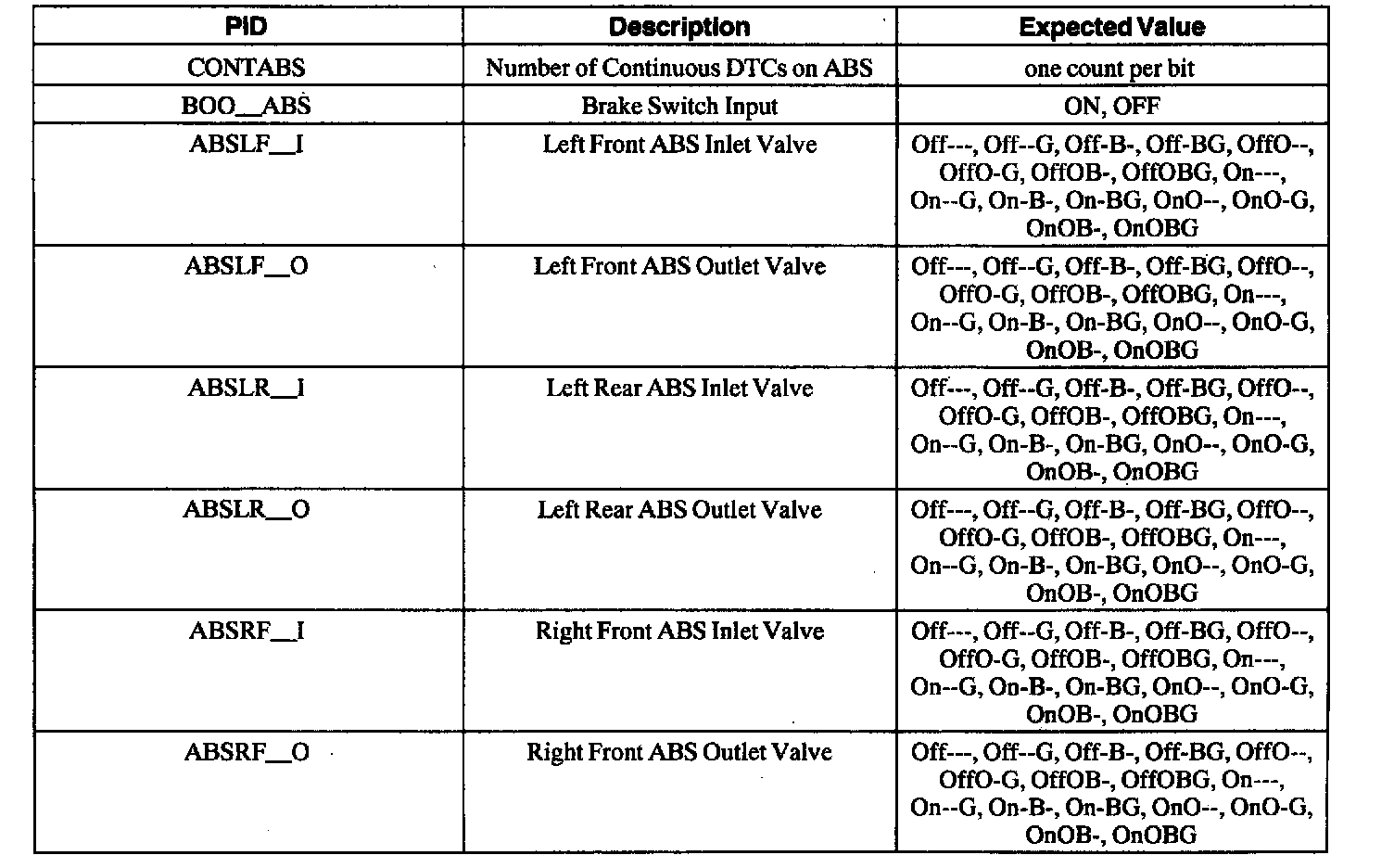 Anti-Lock Brake Control Module Parameter Identification (PID) Index