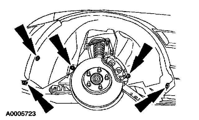 5. Remove the left wheel well splash shield screws and pin-type fasteners.