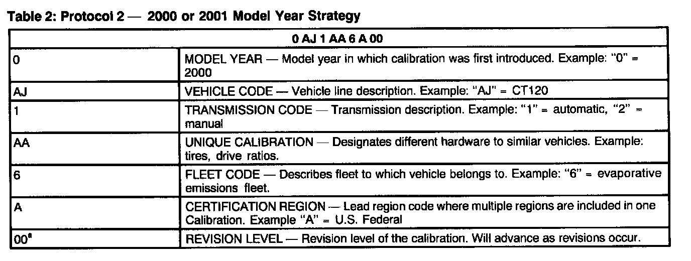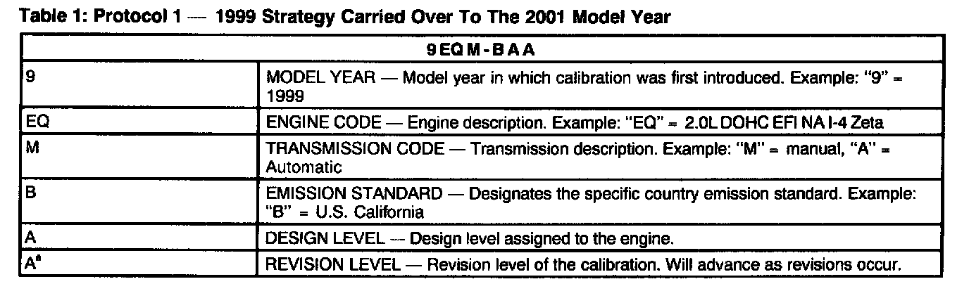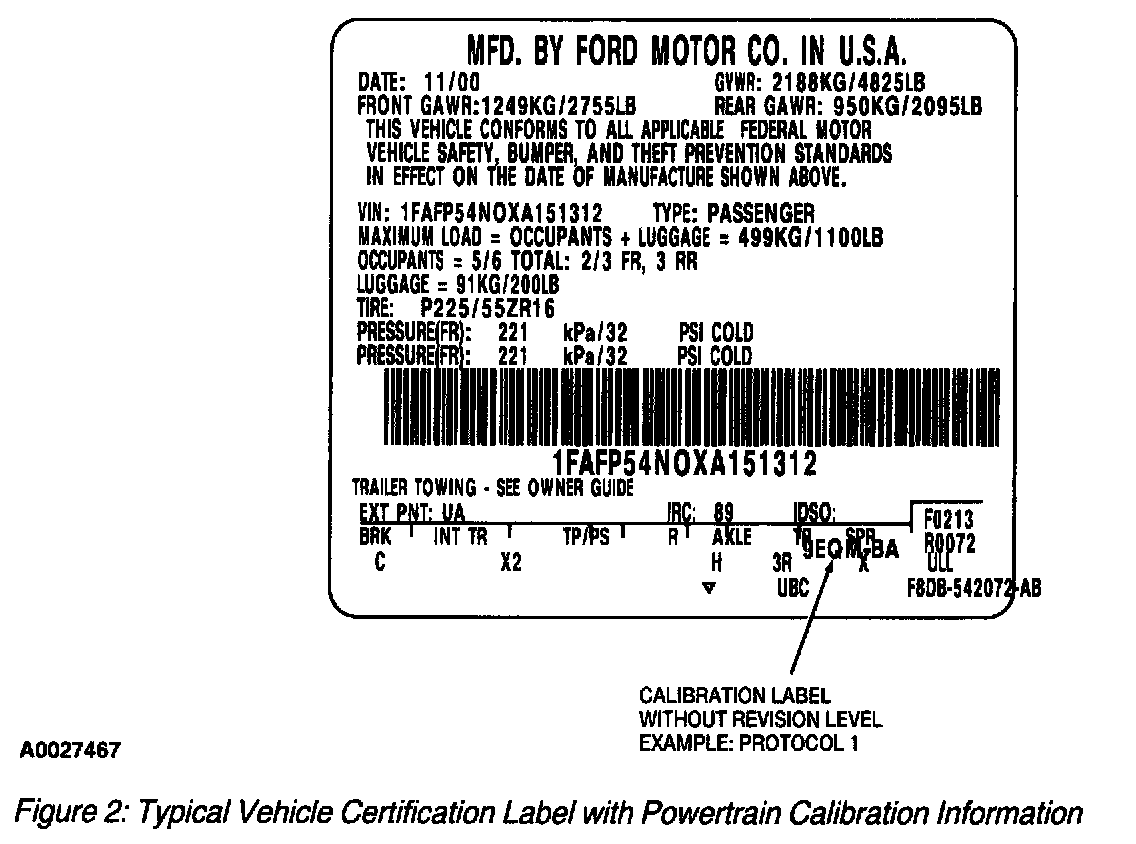 Powertrain Base Calibration Information is located in the lower right corner of the Vehicle Certification Label. Only the Base Calibration will appear on this label (Figure 2). The Revision Level is no longer printed on the label; however, it can be found in On-Line Automotive Service Information System (OASIS). For the current model year Ford Motor Company is using two different Protocols which describe Powertrain Base Calibration. The Protocols are designed to provide worldwide standardization for vehicle calibration. If Electronic Engine Control (EC)'s strategy is two years old and carried over to the current model year, Protocol 1 is used (see table 1). One year old and new strategies for the current model year use Protocol 2 (see table 2). For more information on Vehicle Certification Label or Powertrain Calibration, refer to the appropriate vehicle Systems.