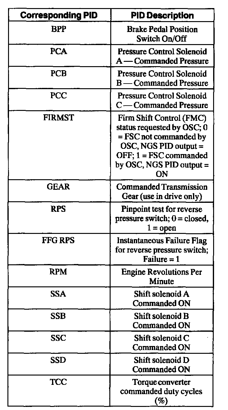Using Output State Control (OSC) and Accessing PIDsTo confirm that the OSC value was sent by the NGS and the PCM has accepted the OSC substitution, a corresponding PID for each OSC parameter must be monitored. Additional PIDs should be monitored to help the technician adequately diagnose the transmission. The following is a list of OSC parameters and their corresponding PIDS: