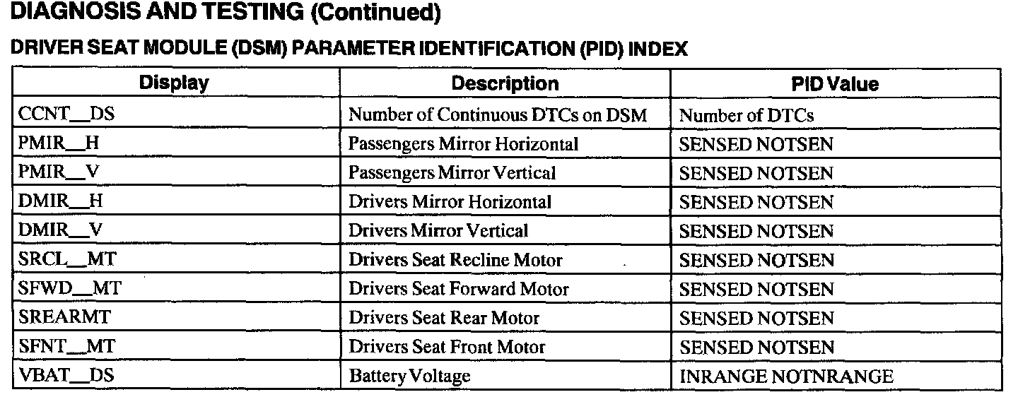 Driver Seat Module (DSM) Parameter Identification (PID) Index: