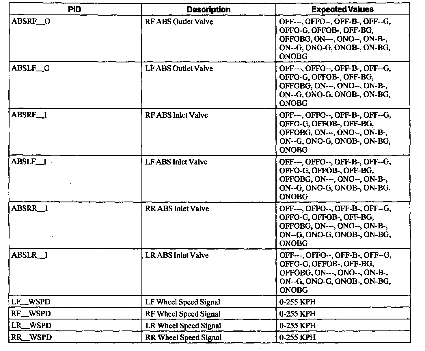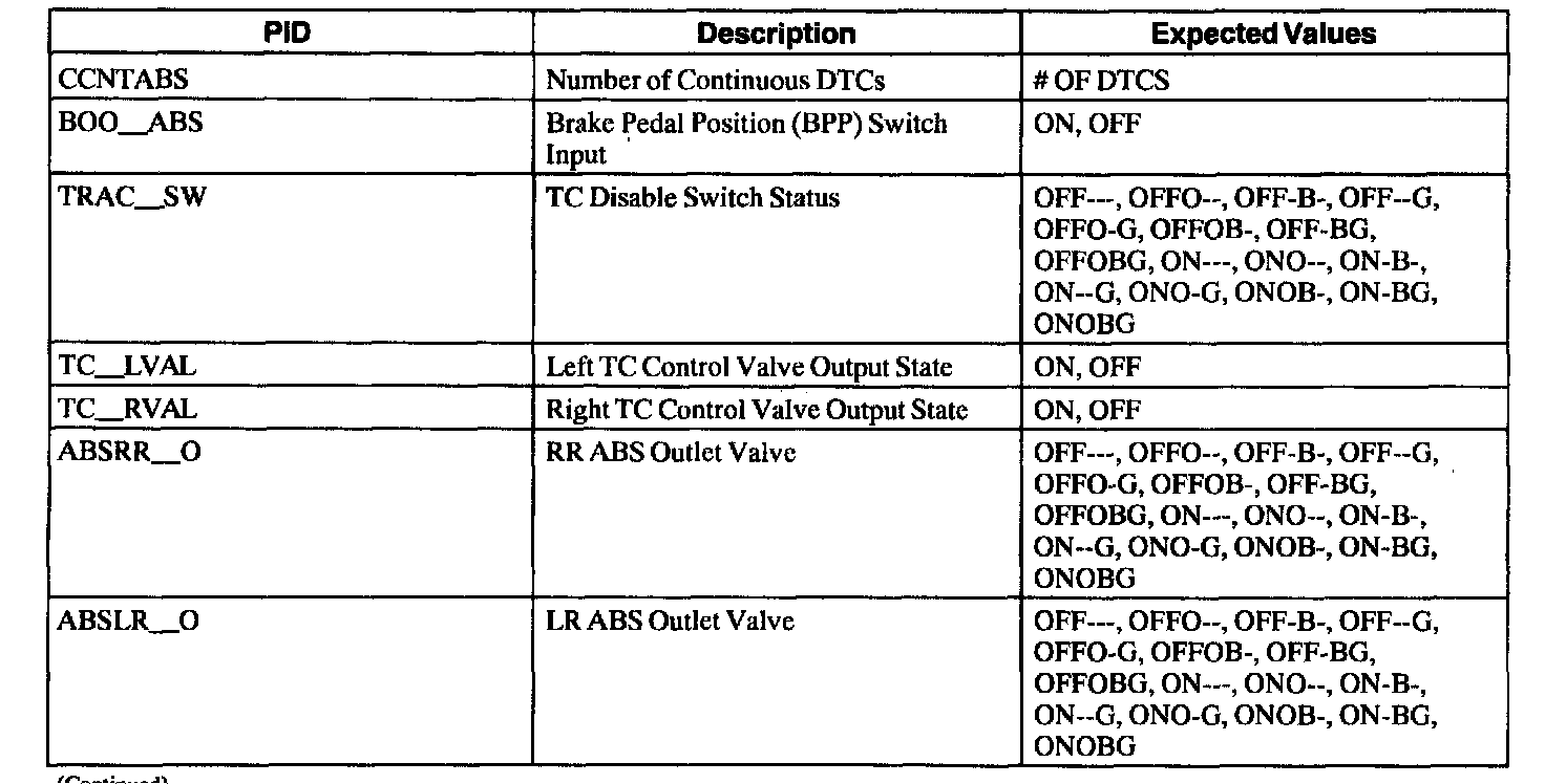 ABS Control Module Parameter Identification (PID) Index