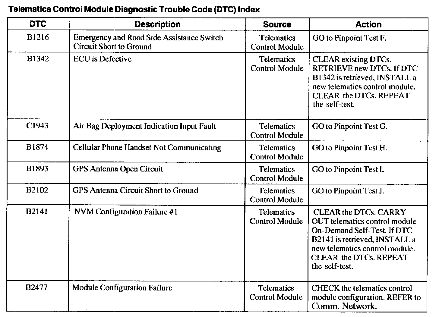 Telematics Control Module Diagnostic Trouble Code (DTC) Index