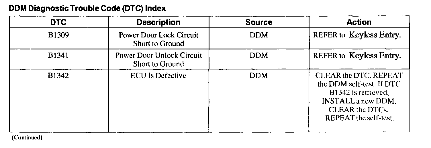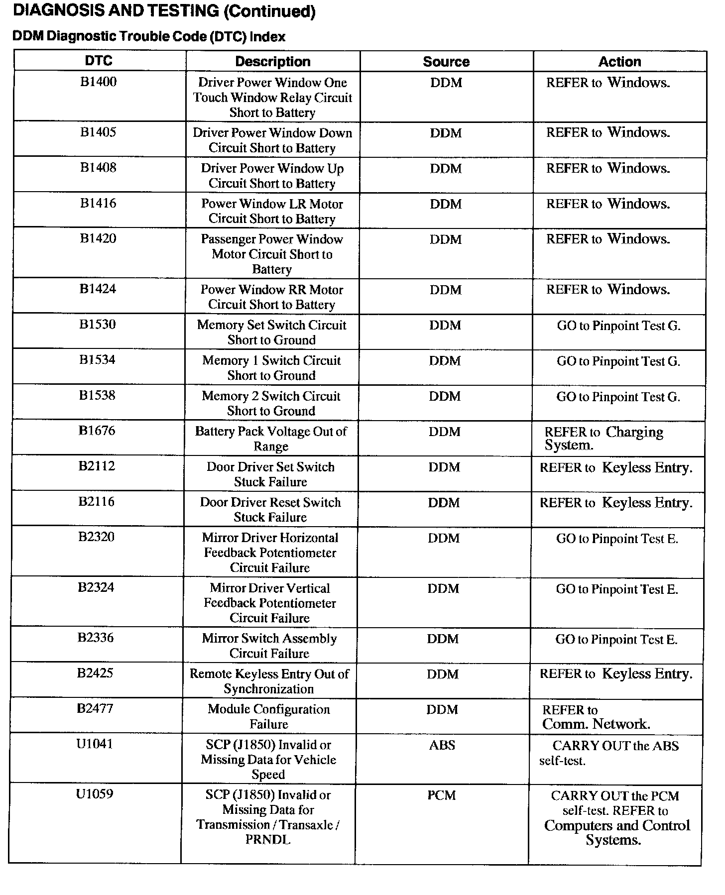 Driver Door Module (DDM) Diagnostic Trouble Code (DTC) Index