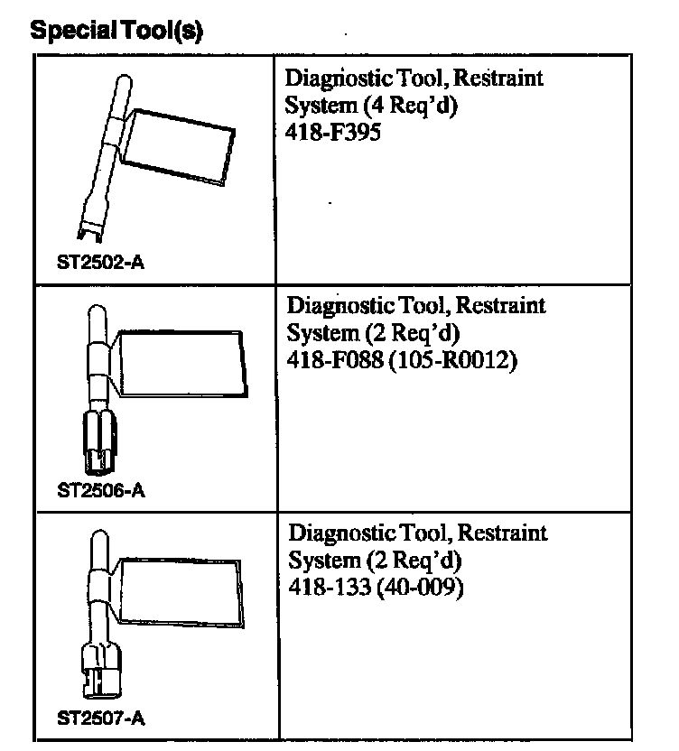 WARNING: THE RESTRAINT SYSTEM DIAGNOSTIC TOOL IS FOR RESTRAINT SYSTEM SERVICE ONLY. REMOVE FROM THE VEHICLE PRIOR TO ROAD USE. FAILURE TO REMOVE COULD RESULT IN INJURY AND POSSIBLE VIOLATION OF VEHICLE SAFETY STANDARDS.