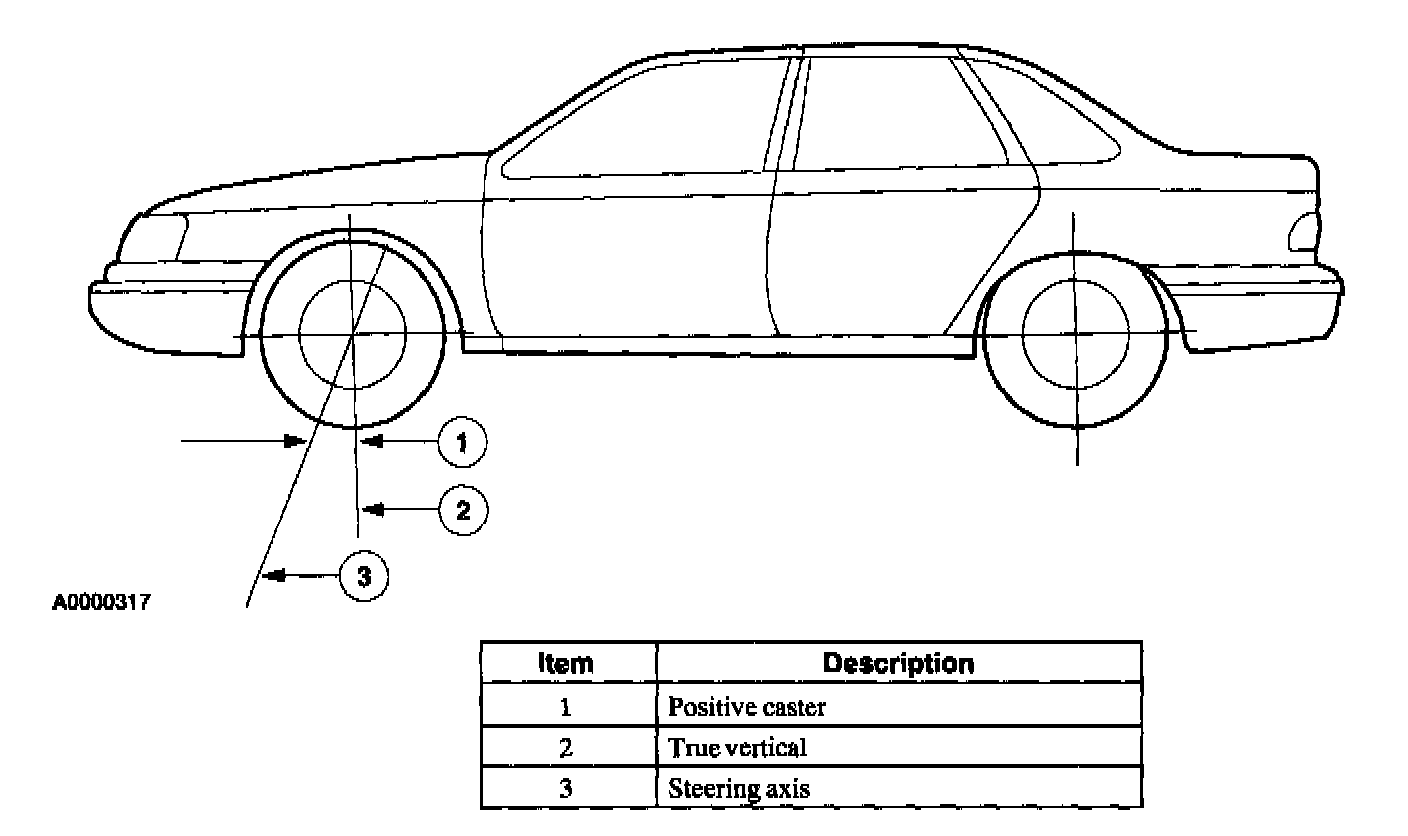 Caster is the deviation from vertical of an imaginary line drawn through the ball joints when viewed from the side. The caster specification will give the vehicle the best directional stability characteristics when loaded and driven. The caster setting is not related to tire wear.