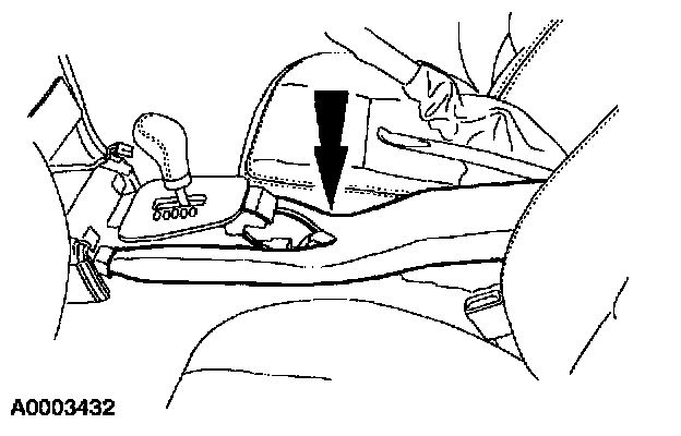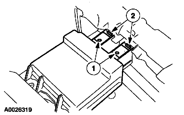 ^ THE RESTRAINTS CONTROL MODULE (RCM) ORIENTATION IS CRITICAL FOR PROPER AIR BAG SUPPLEMENTAL RESTRAINT SYSTEM (SRS) OPERATION. IF A VEHICLE EQUIPPED WITH AN SRS SYSTEM HAS BEEN INVOLVED IN A COLLISION IN WHICH THE CENTER TUNNEL AREA HAS BEEN DAMAGED, INSPECT THE MOUNTING AND BRACKET FOR DEFORMATION. IF DAMAGED, THE RCM MUST BE REPLACED WHETHER OR NOT THE AIR BAGS HAVE DEPLOYED. IN ADDITION, MAKE SURE THE AREA OF THE RCM MOUNTING IS RESTORED TO ITS ORIGINAL CONDITION.