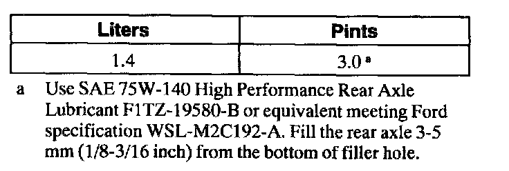 Use SAE 75W-140 High Performance Rear Axle Lubricant F1TZ-19580-B or equivalent meeting Ford specification WSL-M2C192-A. Fill the rear axle 3-5 mm (1/8-3/16 inch) from the bottom of filler hole.