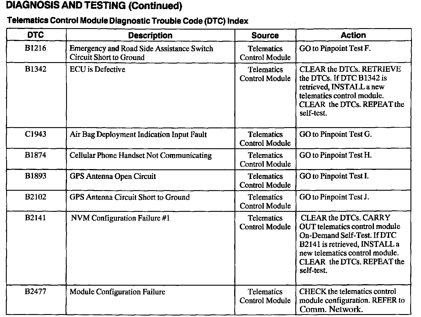 Telematics Control Module Diagnostic Trouble Code (DTC) Index