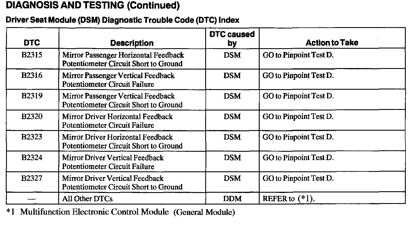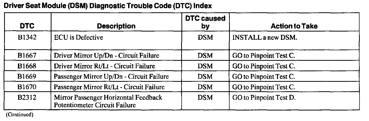 Driver Seat Module (DSM) Diagnostic Trouble Code (DTC) Index
