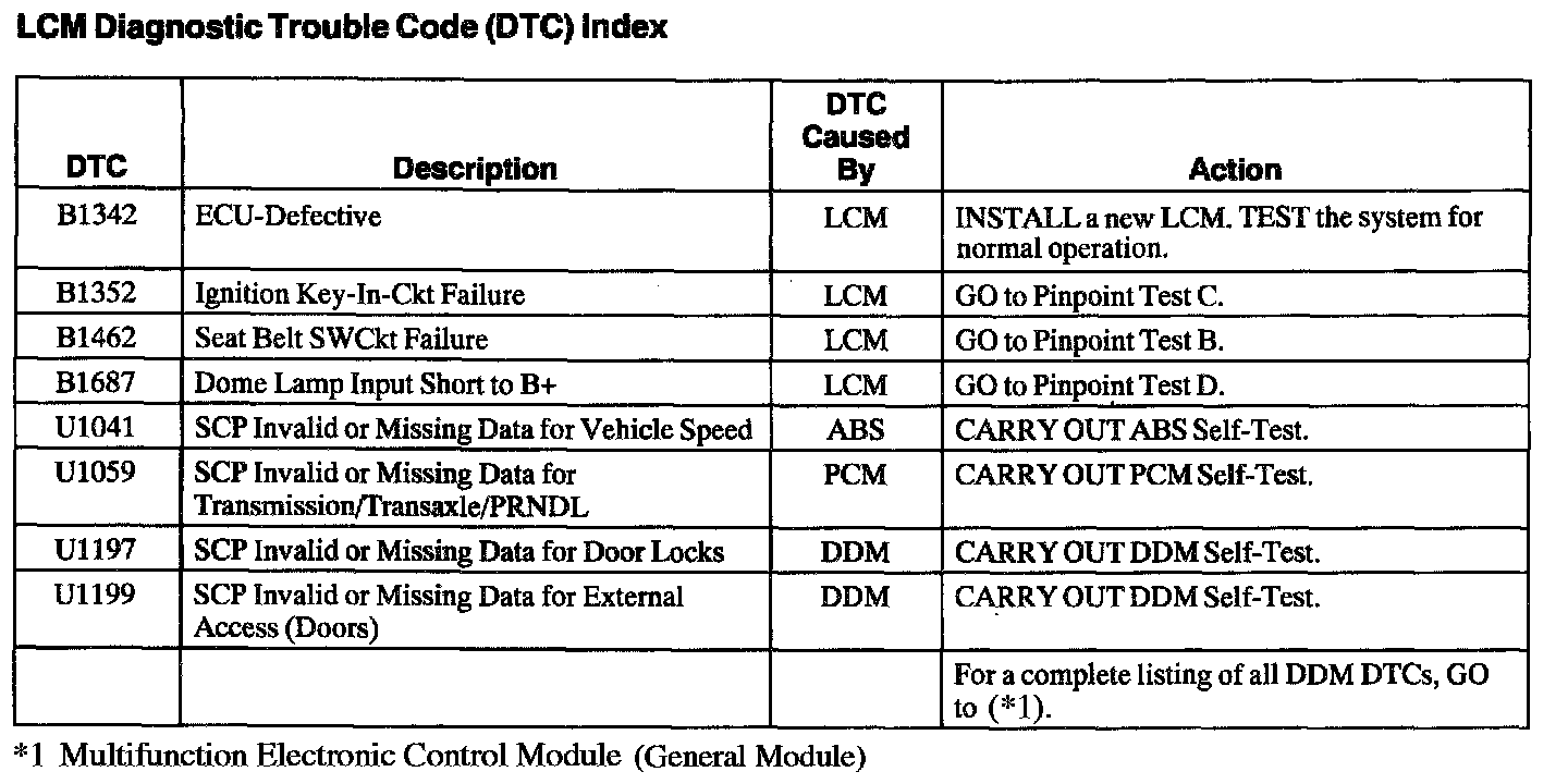 Lighting Control Module (LCM) Diagnostic Trouble Code Index
