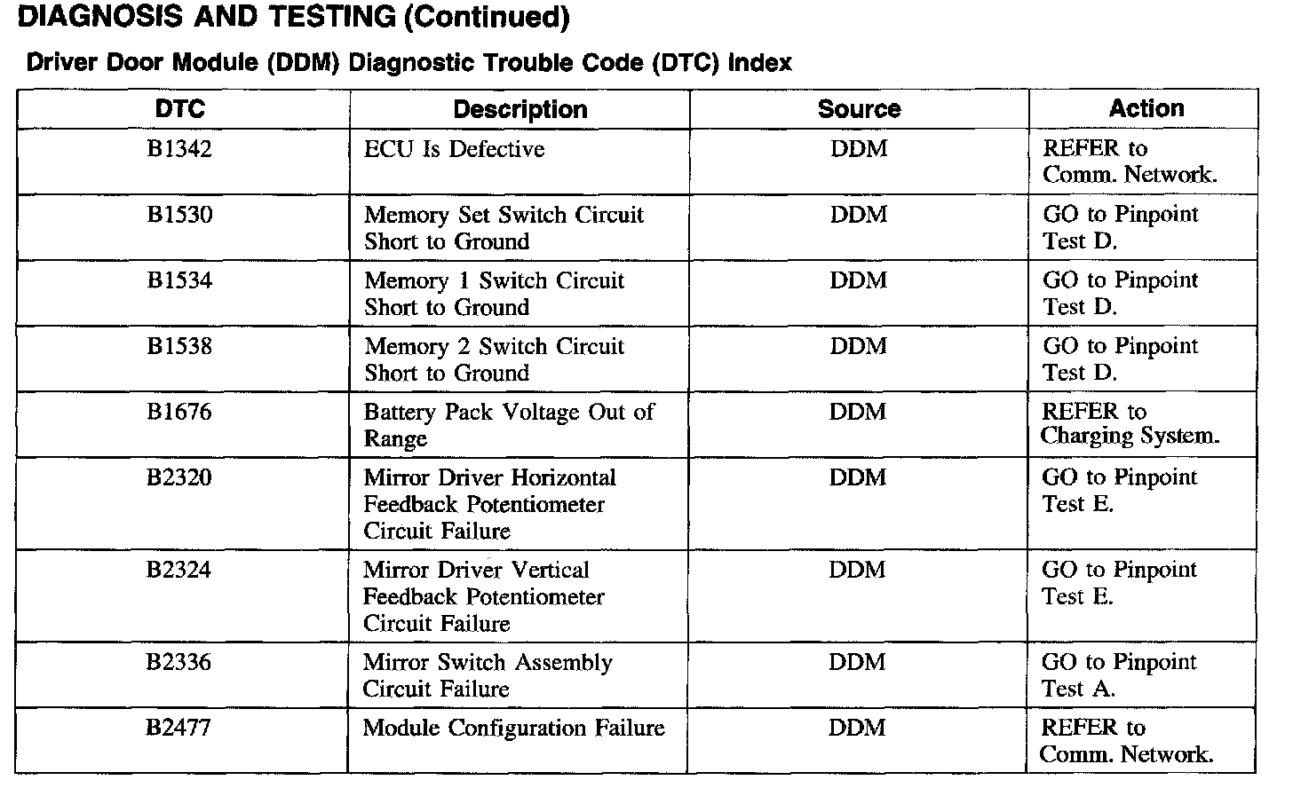 Driver Door Module (DDM) Diagnostic Trouble Code (DTC) Index