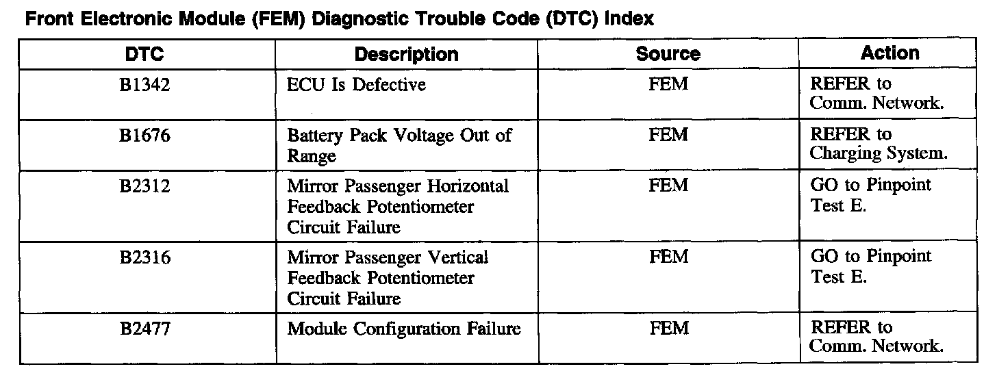 Front Electronic Module (FEM) Diagnostic Trouble Code (DTC) Index