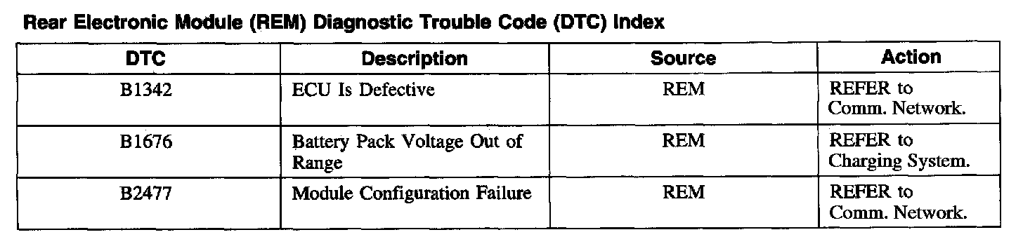 Rear Electronic Module (REM) Diagnostic Trouble Code (DTC) Index
