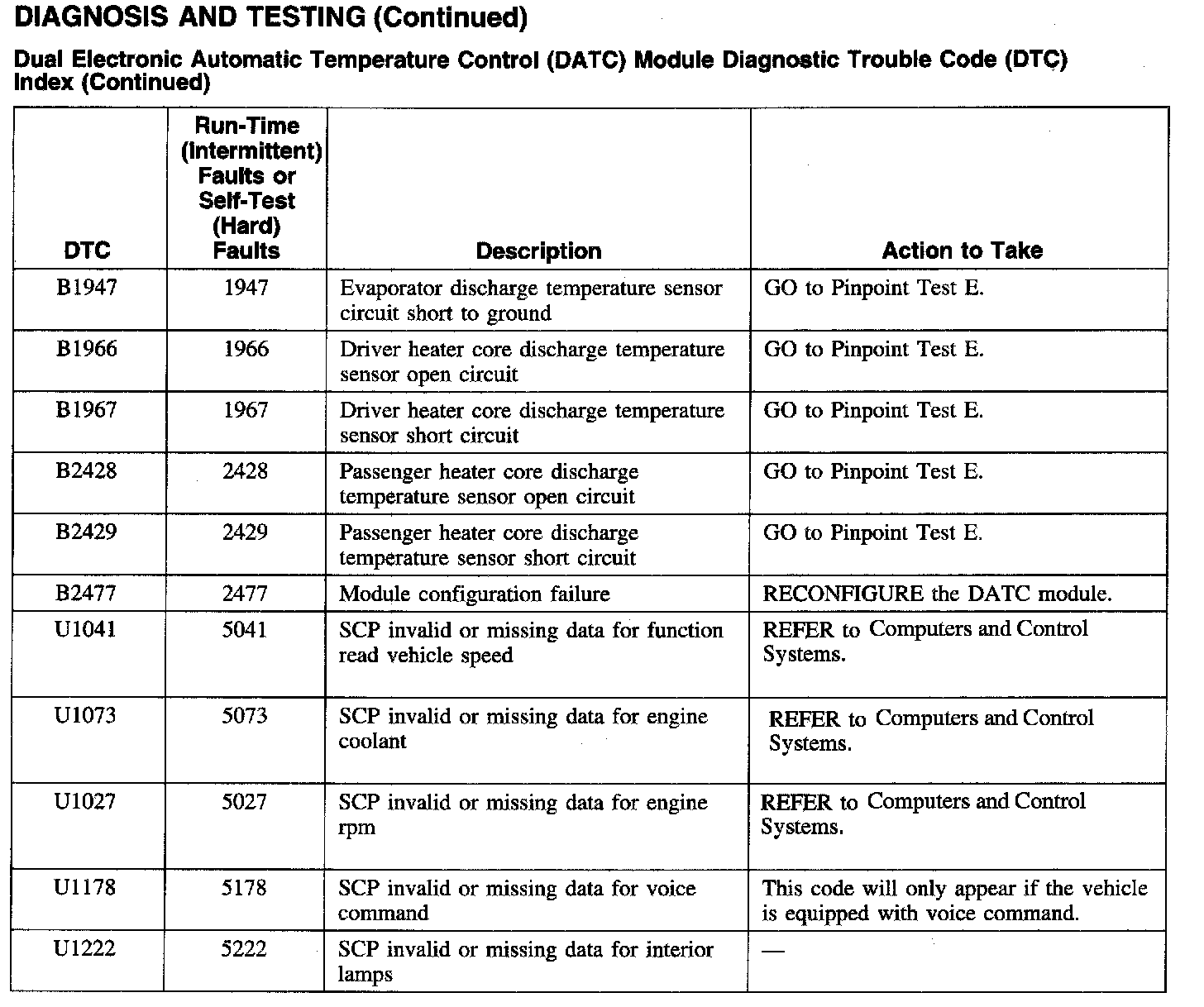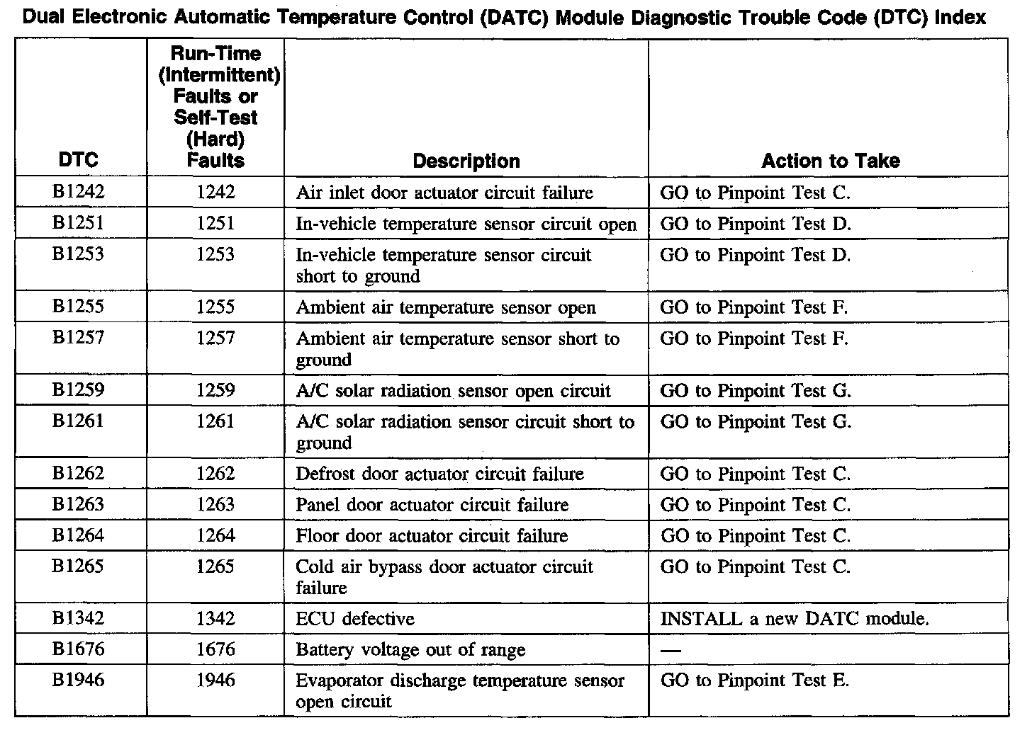 DUAL ELECTRONIC AUTOMATIC TEMPERATURE CONTROL (DATC) MODULE DIAGNOSTIC TROUBLE CODE (DTC) INDEX