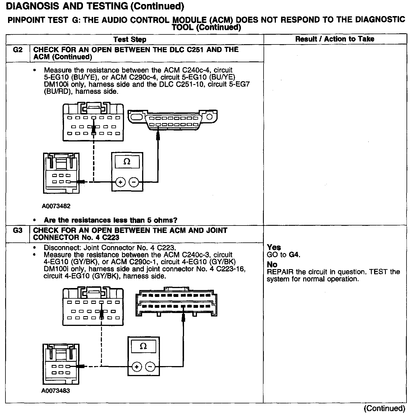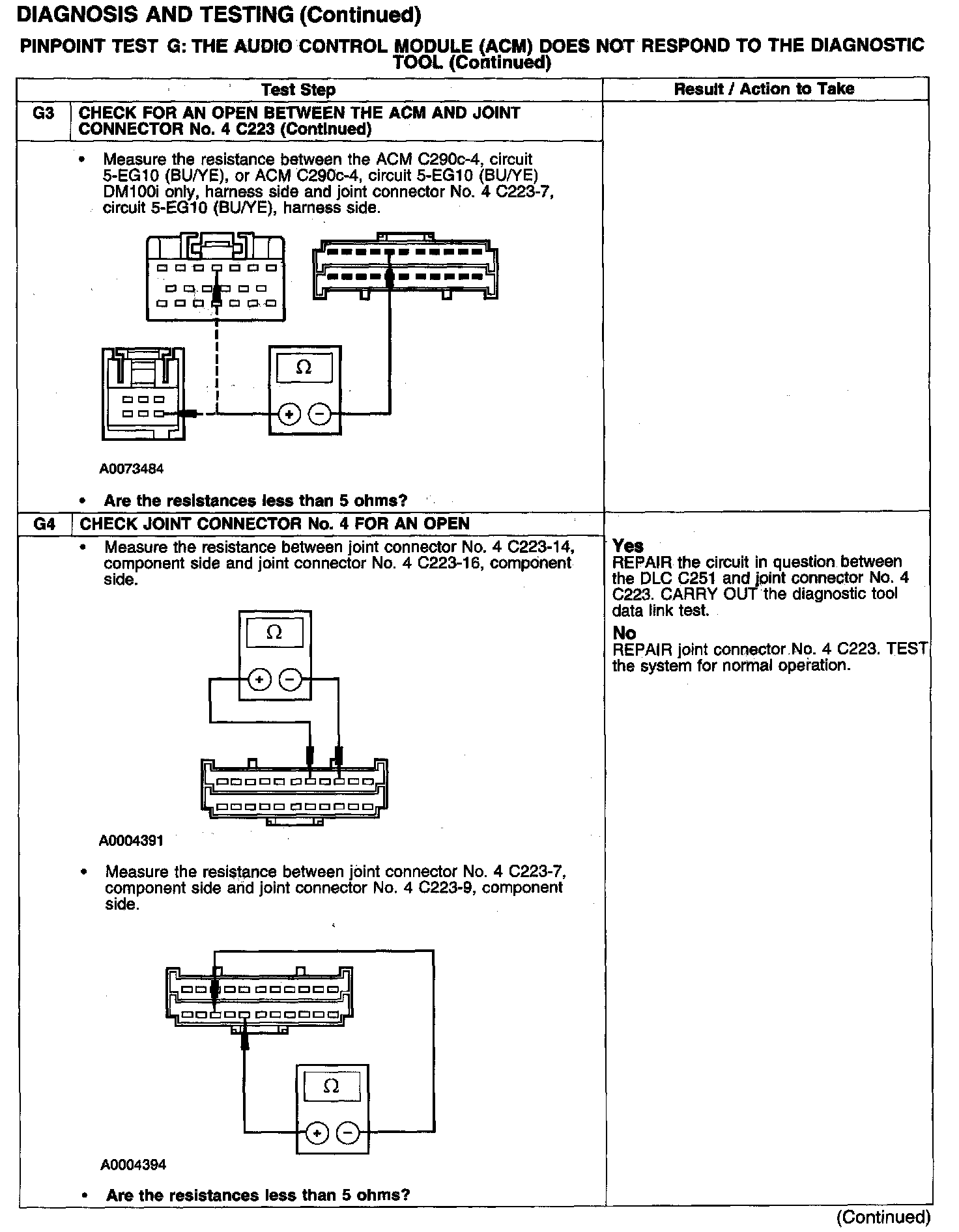 The ACM module communicates with the diagnostic tool through the SCP communications network circuits 4-EG10 (GY/BK) and 5-EG10 (BU/YE). If one of the bus wires becomes shorted to ground or voltage, or if some but not all termination resistors are lost, communications can continue. Check circuits 4-EG10 (GY/BK) and 5-EG10 (BU/YE) between the ACM C240c and the DLC C251. Total resistance values must not be more than 5 ohms. If the resistance is more than 5 ohms, there is either an open in circuits 4-EG10 (GY/BK) and 5-EG10 (BU/YE), damage to the DLC C251, the ACM C240c, or in joint connector No.4 C223.