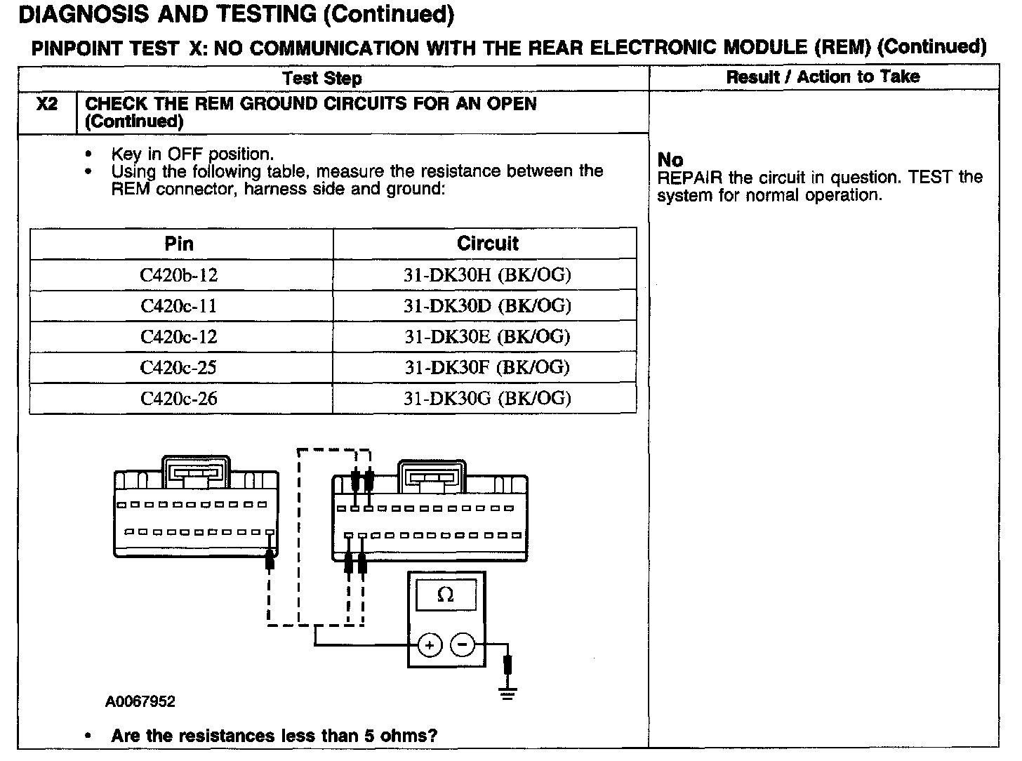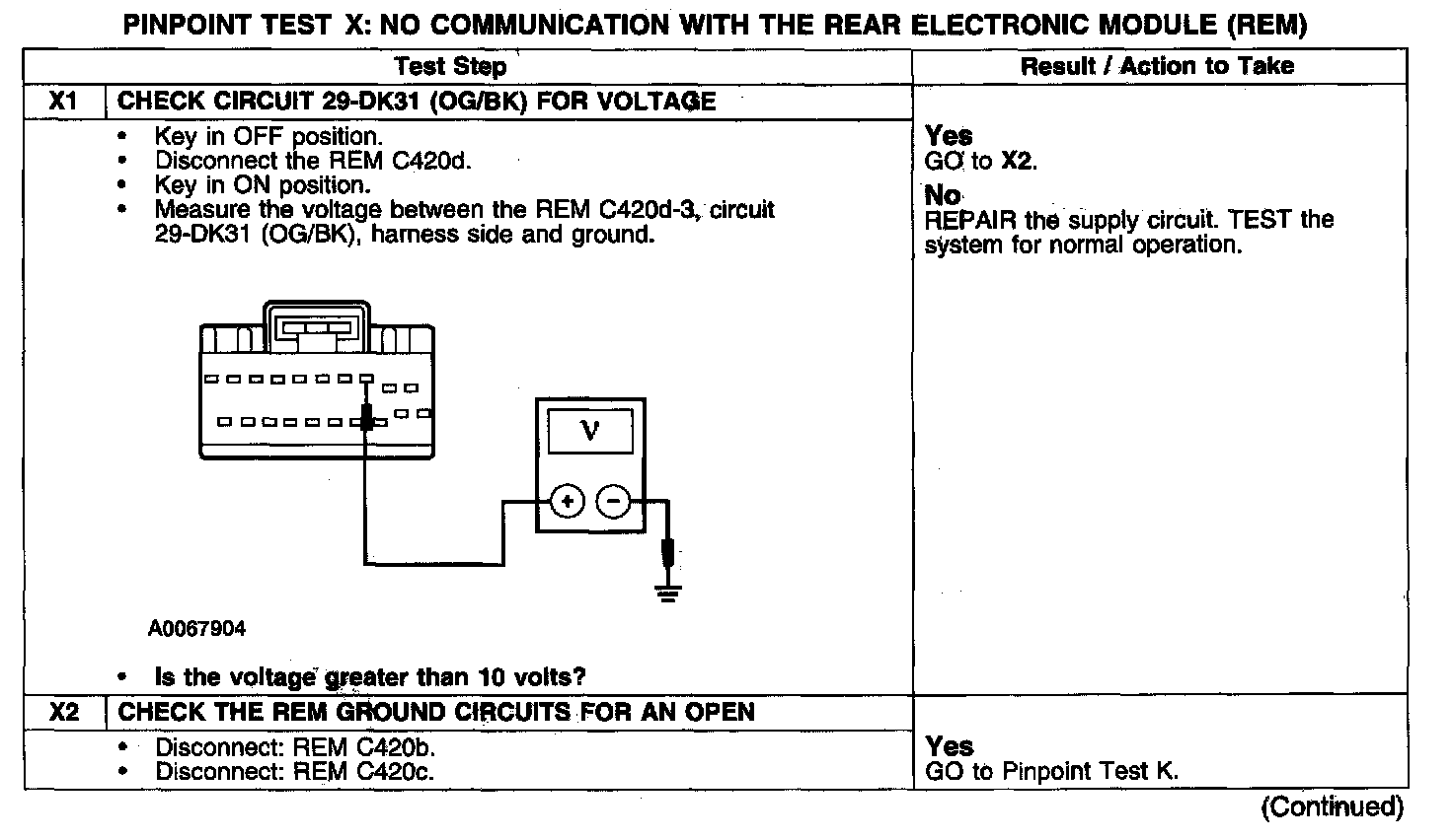 PINPOINT TEST X: NO COMMUNICATION WITH THE REAR ELECTRONIC MODULE (REM)Test X1-X2: