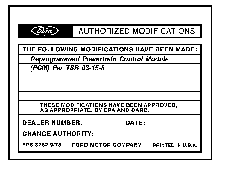 Obtain an Authorized Modifications Decal (FPS 8262 - obtainable through DOES II, 25/pkg) and list the date, dealer number, and summary of modifications performed. Select a prominent place adjacent to the Vehicle Emission Control Information Decal suitable for installing the Authorized Modifications Decal. Clean the area, install the decal, and cover it with a clear plastic decal shield.