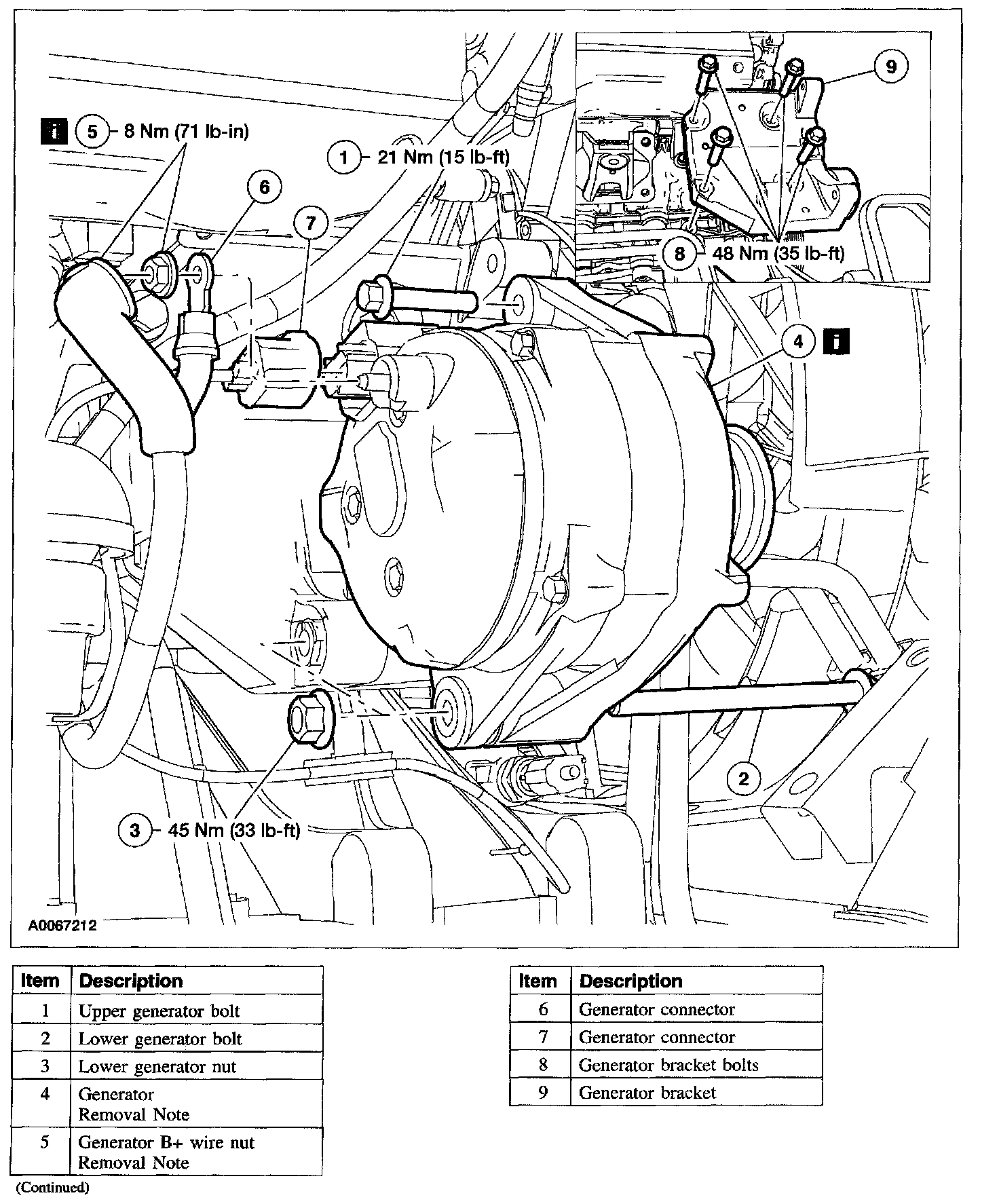 - The generator must be supported by hand after removing the bolts prior to disconnecting the electrical connector or damage to the harness may result.