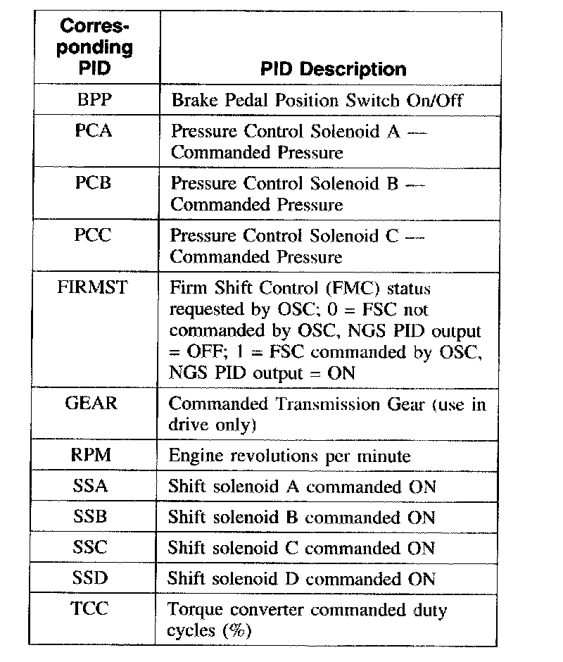 The pressure control (PCx) solenoids for this transmission are not directly controlled during DRIVE MODE testing. Pressures may be raised during an upshift via the harsh shift control channel (FIRM_SFT)