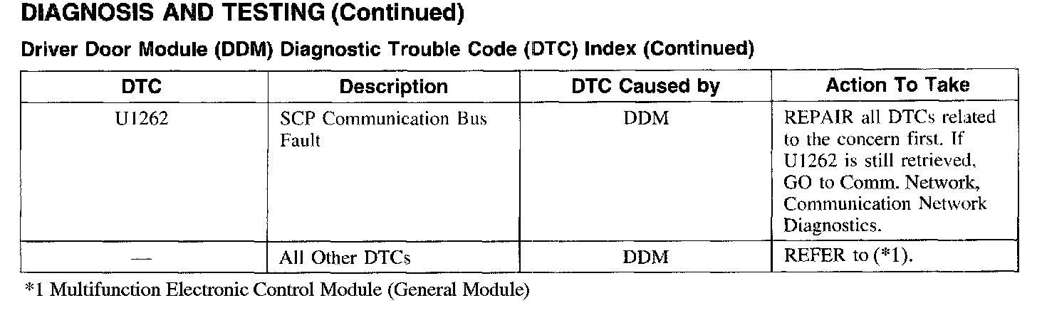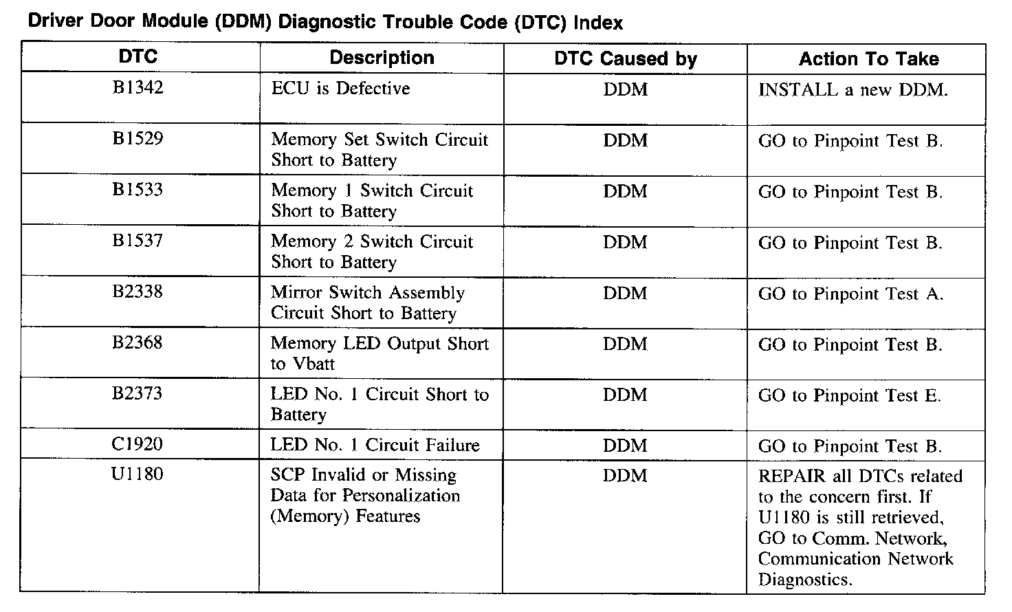 Driver Door Module (DDM) Diagnostic Trouble Code (DTC) Index