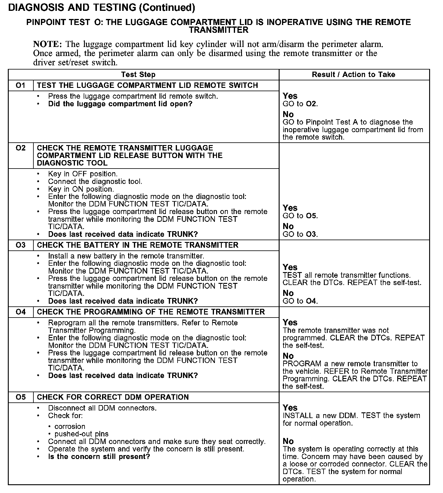 PINPOINT TEST O: THE LUGGAGE COMPARTMENT LID IS INOPERATIVE USING THE REMOTE TRANSMITTERTest O1-O5: