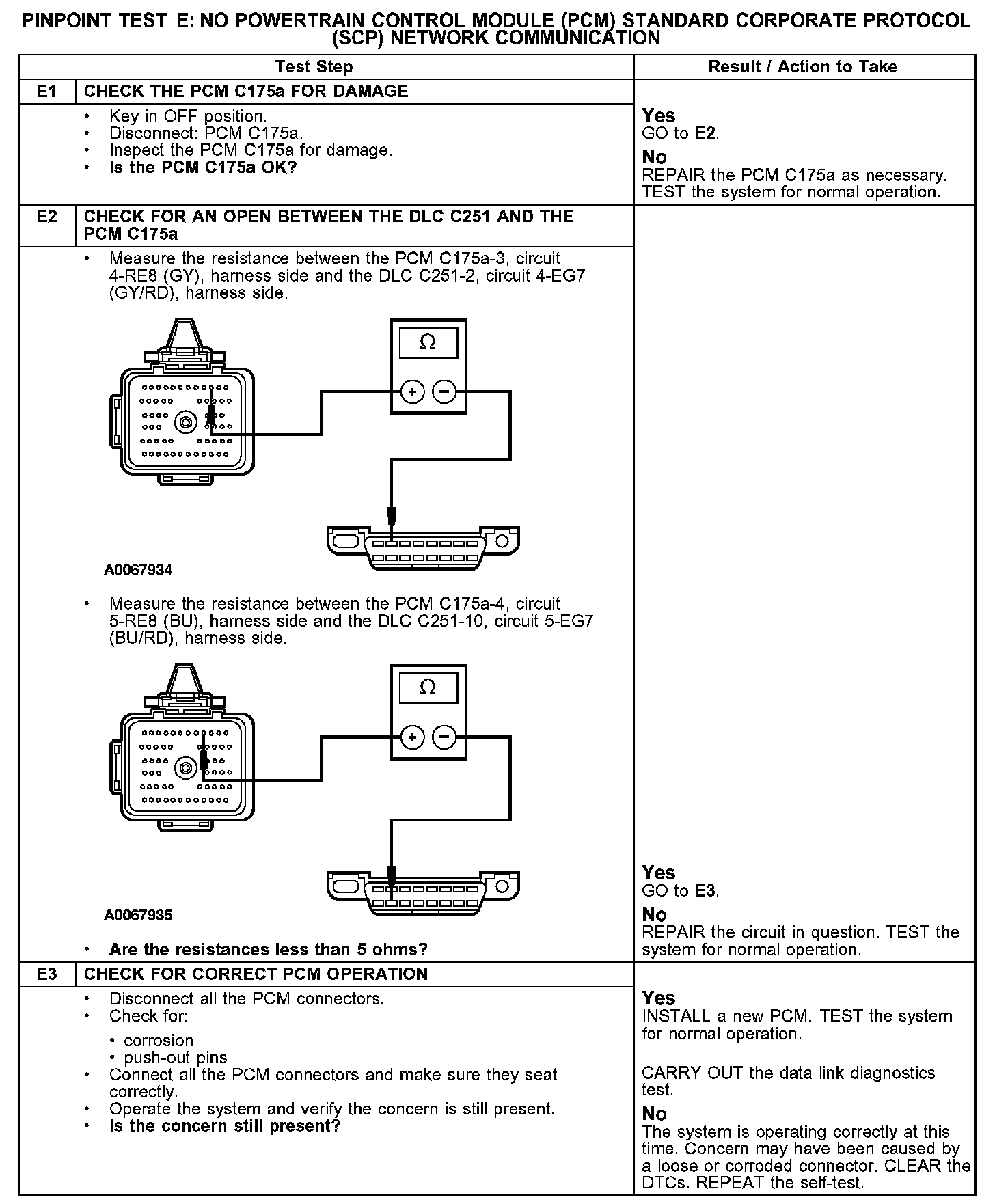PINPOINT TEST E: NO POWERTRAIN CONTROL MODULE (PCM) STANDARD CORPORATE PROTOCOL (SCP) NETWORK COMMUNICATIONTest E1-E3: