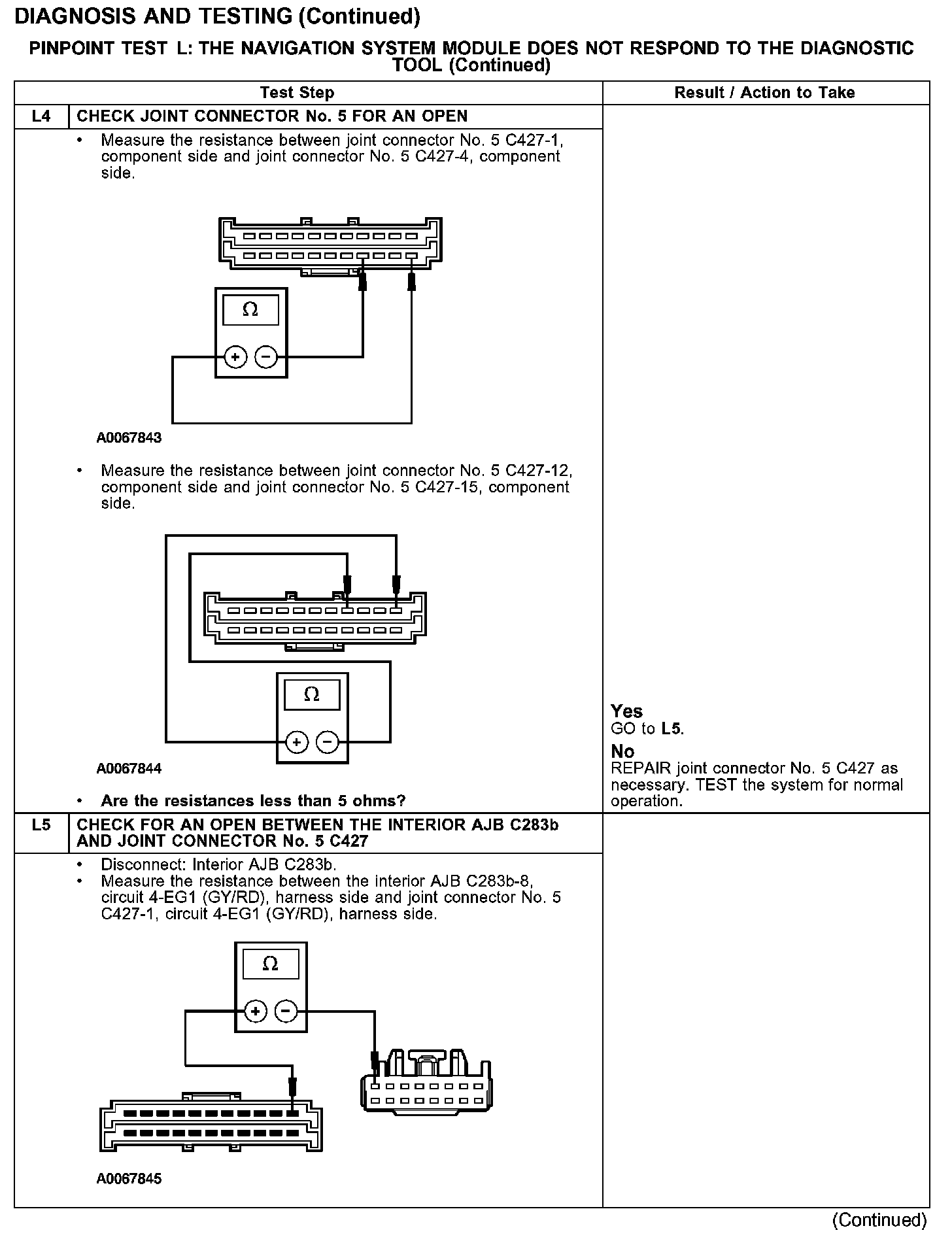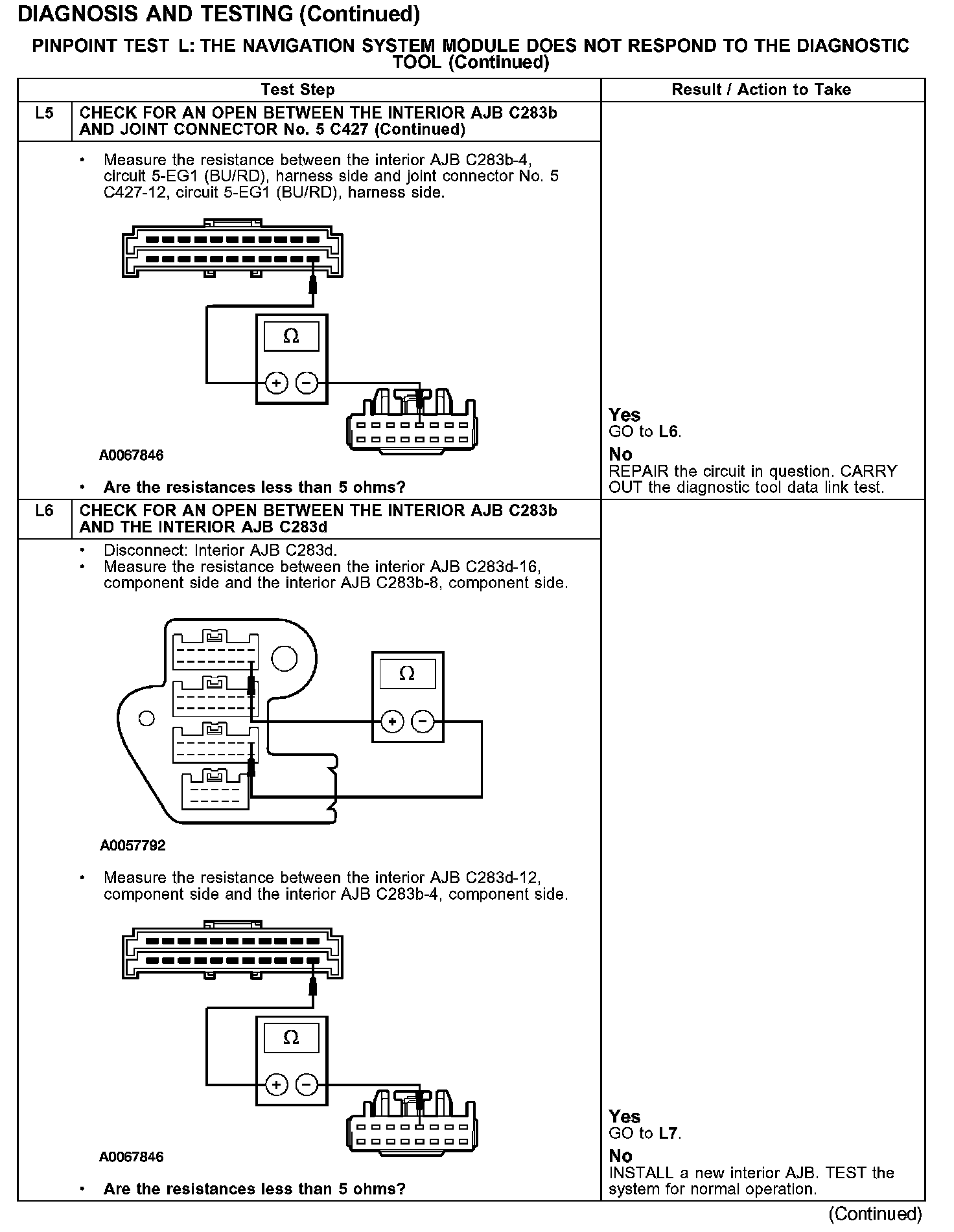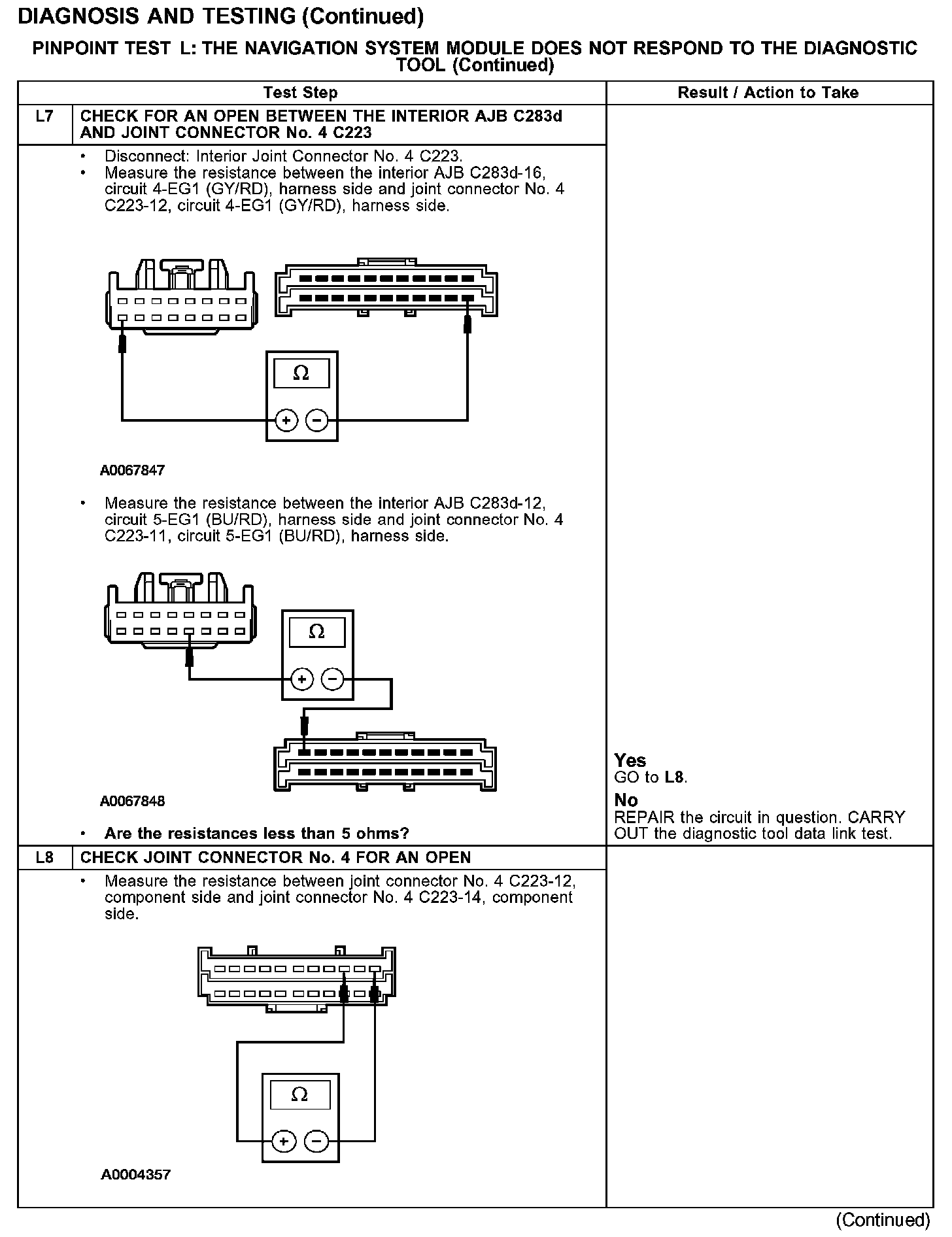 The navigation system module communicates with the diagnostic tool through the SCP communications network circuits 4-EG17 (GY/BK) and 5-EG17 (BU/YE). If one of the bus wires becomes shorted to ground or voltage, or if some but not all termination resistors are lost, communications can continue. Check circuits 4-EG17 (GY/BK) and 5-EG17 (BU/YE) between the navigation system module C4209 and the data link connector (DLC) C251. Total resistance values must not be more than 5 ohms. If the resistance is more than 5 ohms, there is either an open in circuit 4-EG17 (GY/BK) and 5-EG17 (BU/YE), damage to the DLC C251, damage to the navigation system module C4209, or a problem in the interior auxiliary junction box (AJB) C283c, C283d, joint connector No.5 C427 or joint connector No.4 C223.
