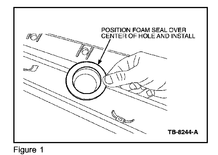 4. Install a new foam seal (5W4Z-54021A46-A), centering the seal on the hole of the cowl panel grille (Figure 1).