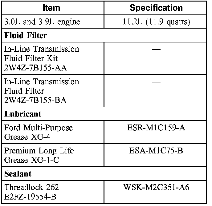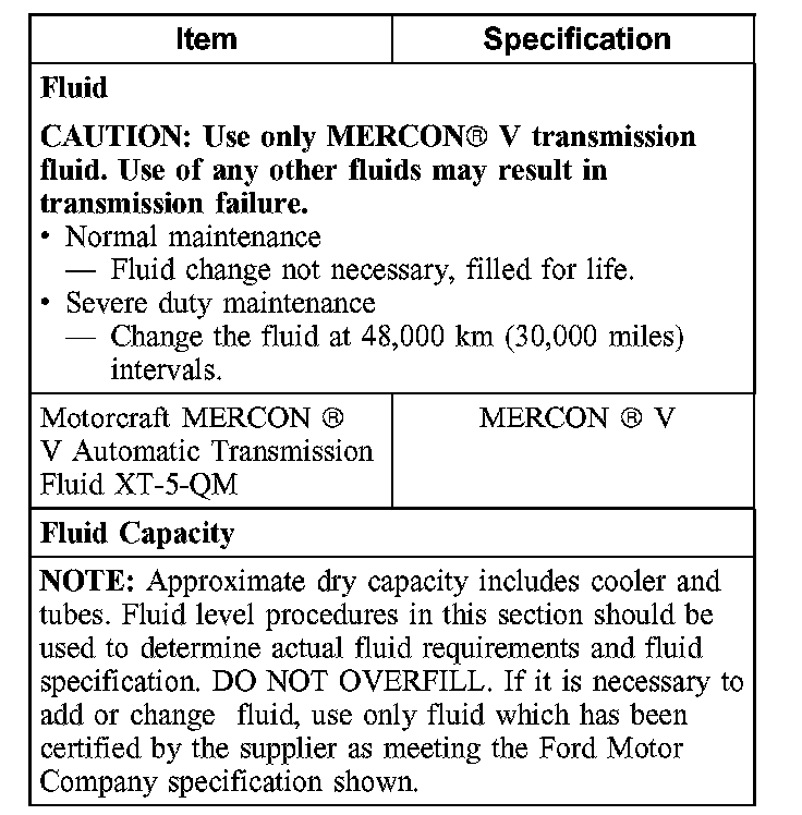 NOTE: Approximate dry capacity includes cooler and tubes. Fluid level procedures in this section should be used to determine actual fluid requirements and fluid specification. DO NOT OVERFILL. If it is necessary to add or change fluid, use only fluid which has been certified by the supplier as meeting the Ford Motor Company specification shown.