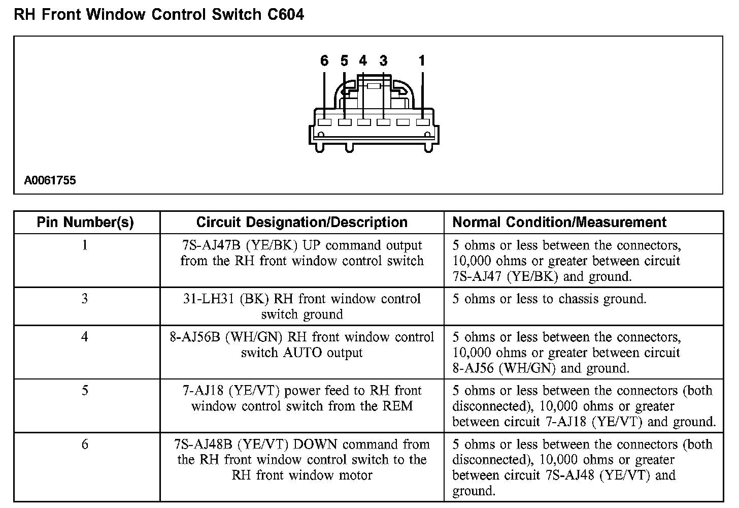 RH Front Window Control Switch C604: