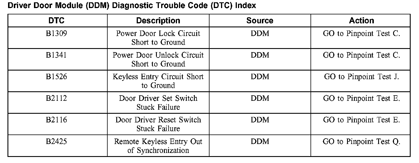 Driver Door Module (DDM) Diagnostic Trouble Code (DTC) Index
