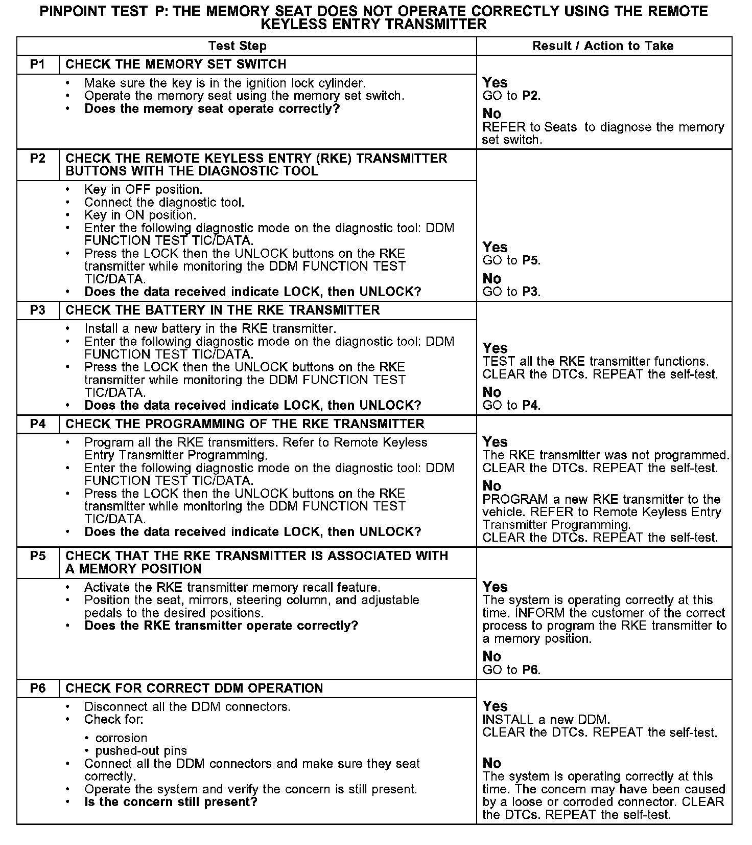 PINPOINT TEST P: THE MEMORY SEAT DOES NOT OPERATE CORRECTLY USING THE REMOTE KEYLESS ENTRY TRANSMITTERP1-P6: