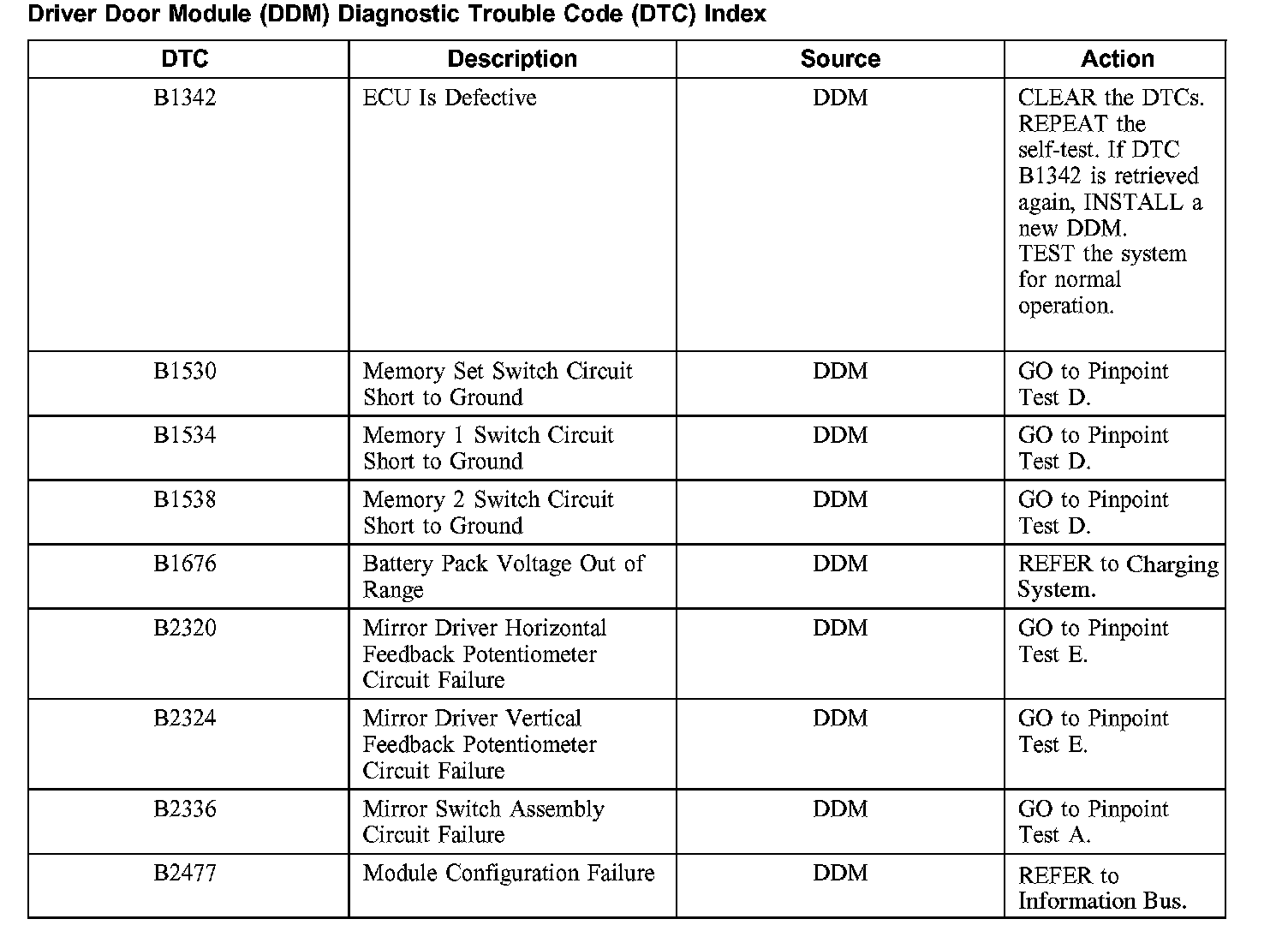 Driver Door Module (DDM) Diagnostic Trouble Code (DTC) Index