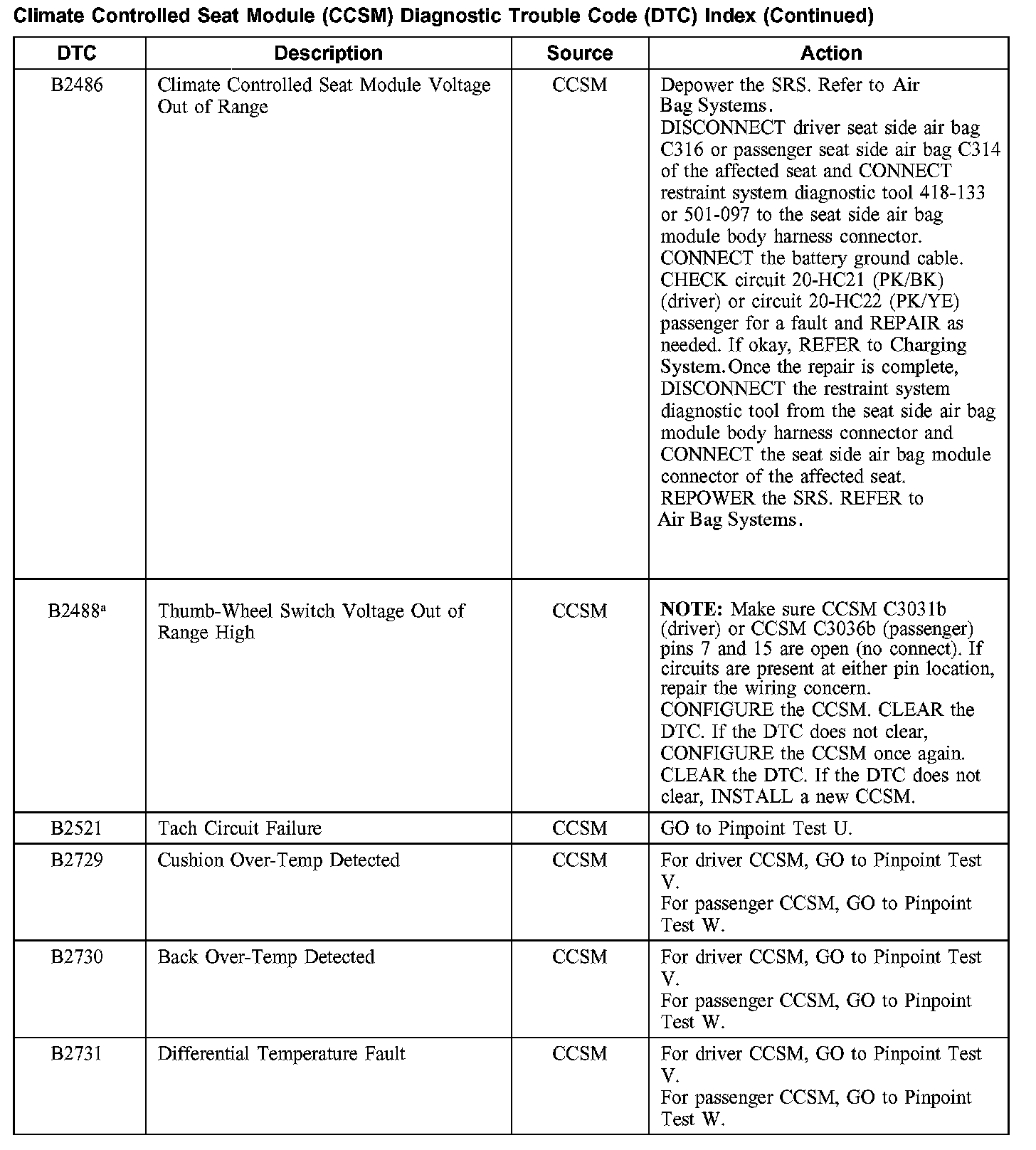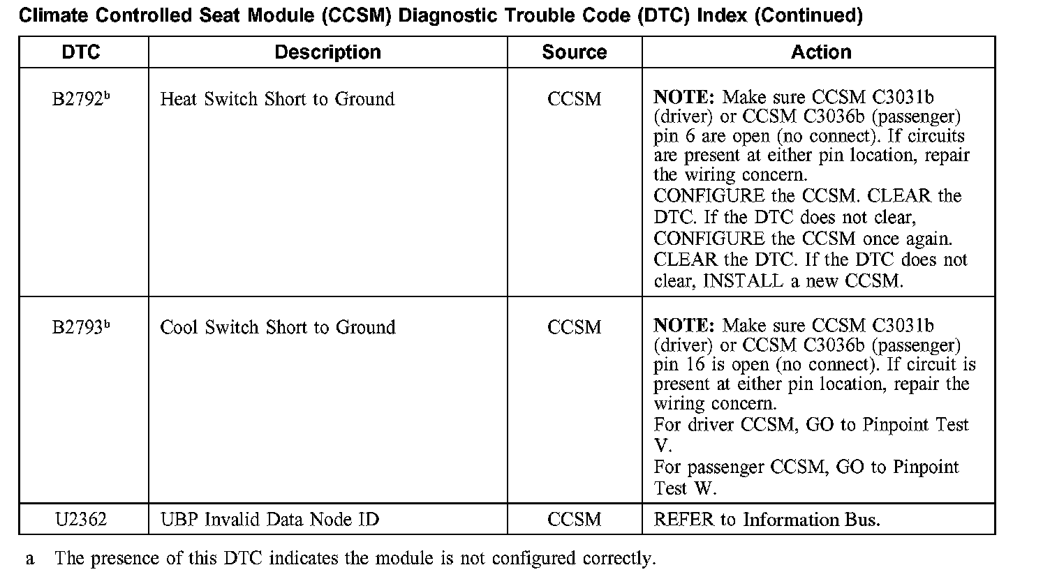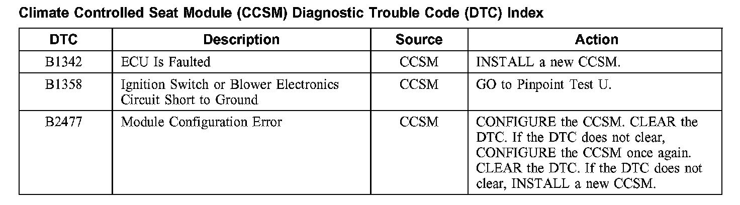 Climate Controlled Seat Module (CCSM) Diagnostic Trouble Code (DTC) Index