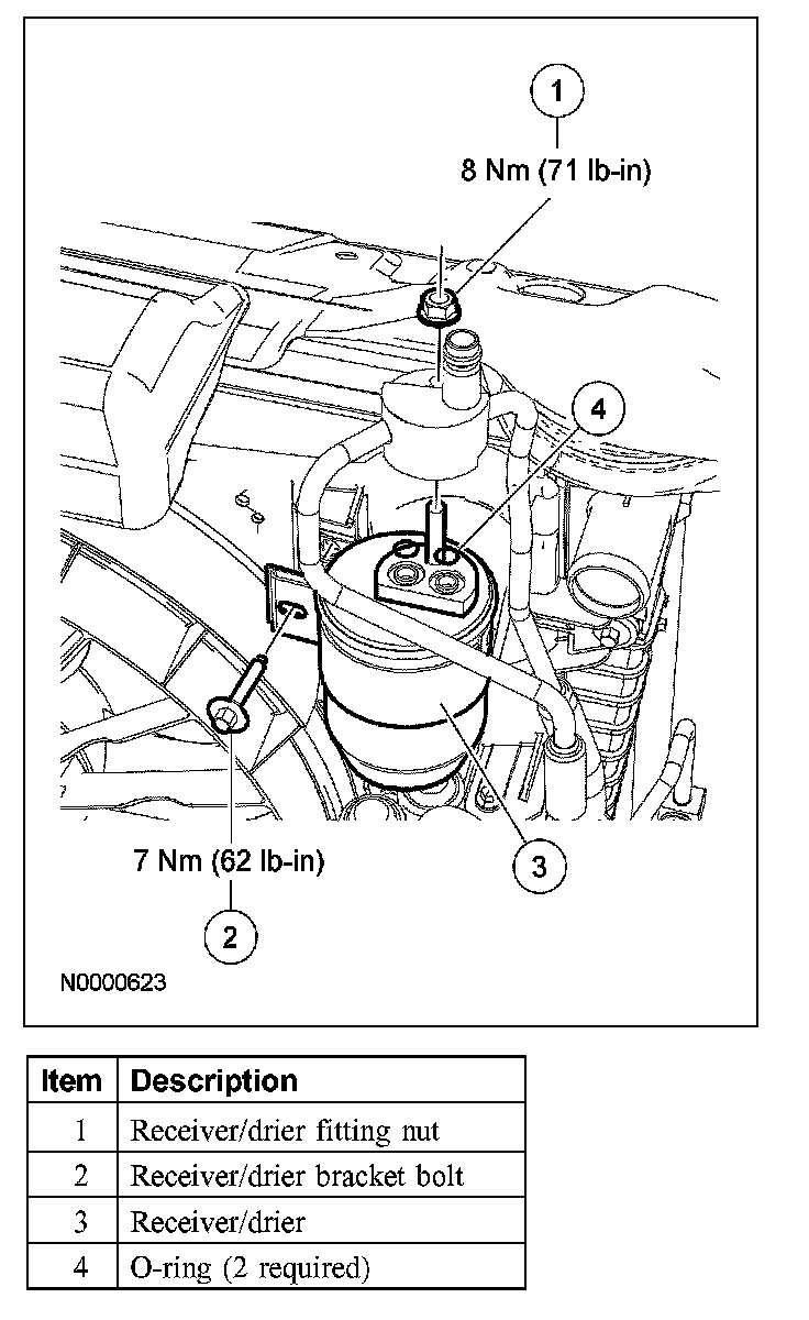 NOTE: Installation of a new receiver/drier is not required when repairing the air conditioning system except when there is physical evidence of contamination from a failed A/C compressor or damage to the receiver/drier.
