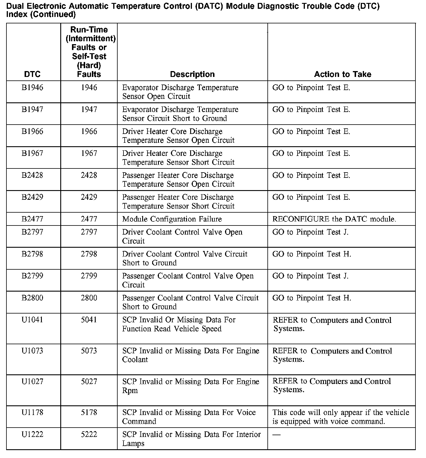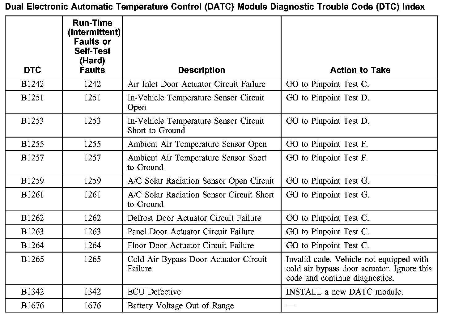 Dual Electronic Automatic Temperature Control (DATC) Module Diagnostic Trouble Code (DTC) Index