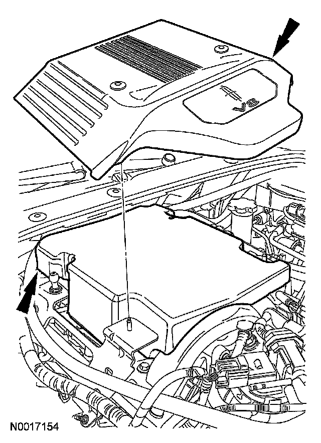 2. CAUTION: The engine appearance cover is equipped with a noise suppressor. If the noise suppressor becomes separated from the engine appearance cover it must be positioned on the intake manifold prior to installing the engine appearance cover.