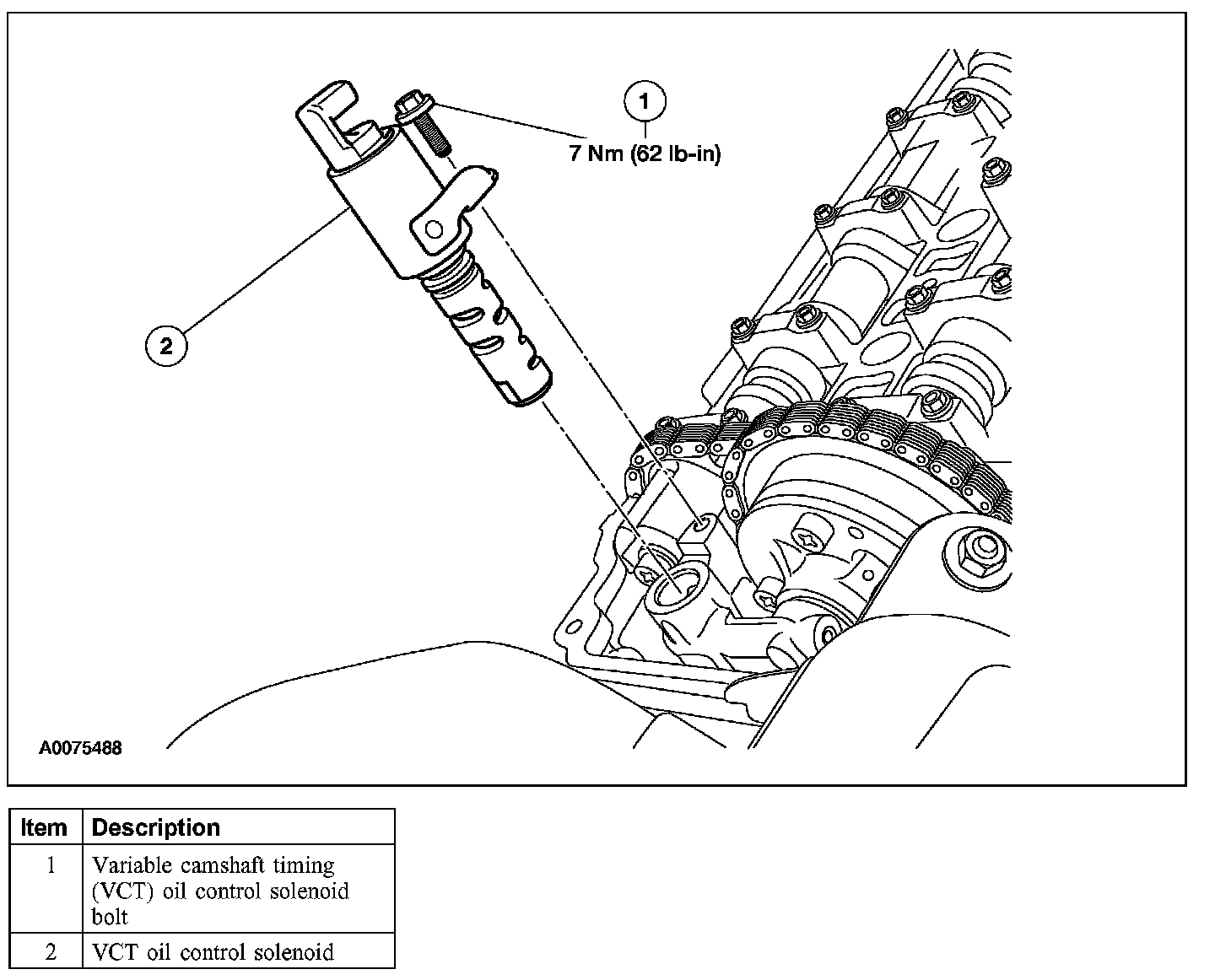 2. Remove the bolt and the variable camshaft timing (VCT) oil control solenoid.