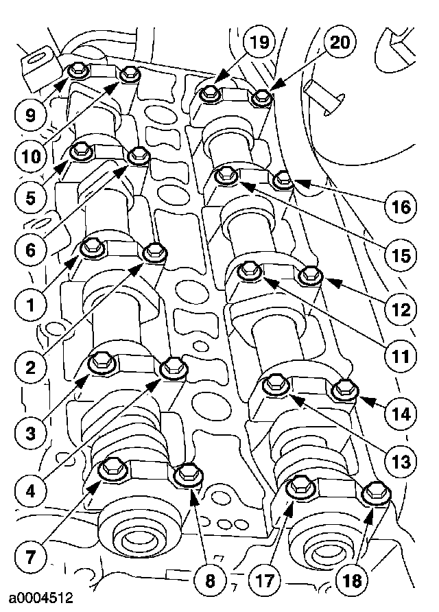 Install and tighten the LH head bolts in 4 stages in the sequence shown.
