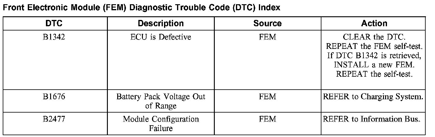 Front Electronic Module (FEM) Diagnostic Trouble Code (DTC) Index