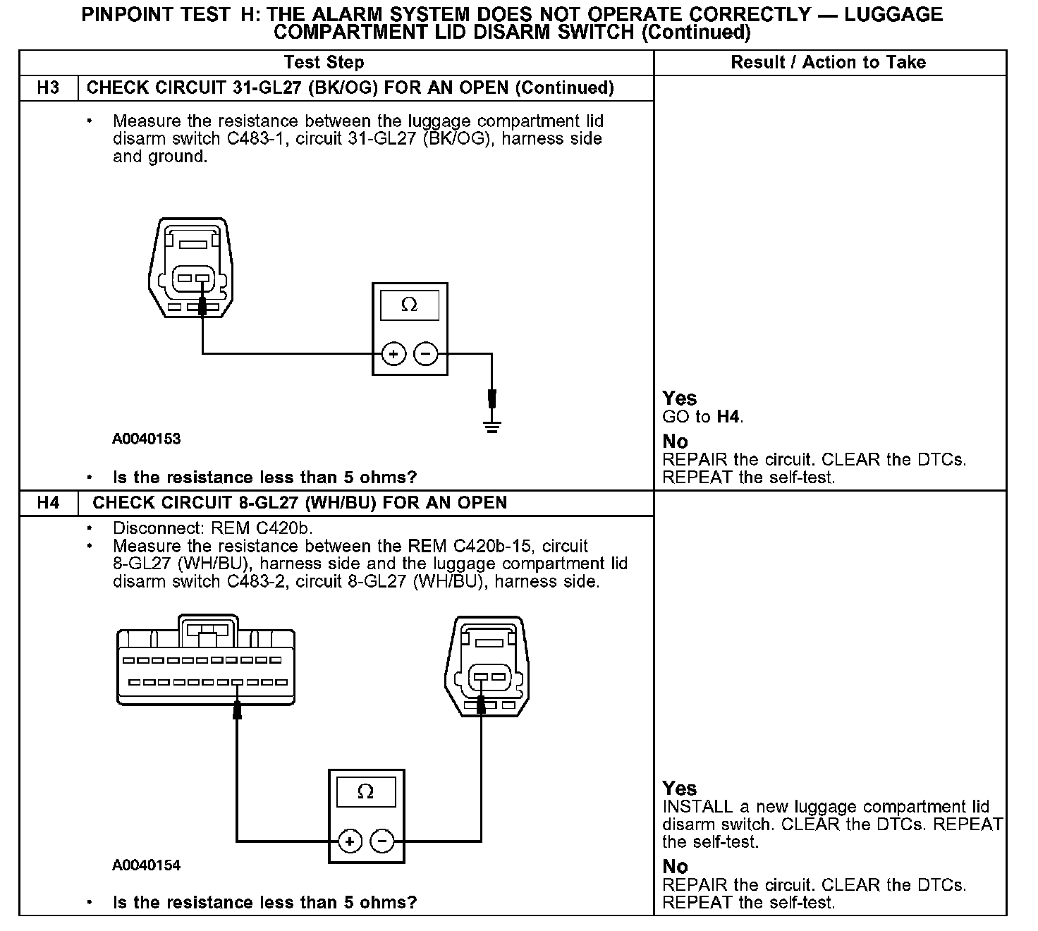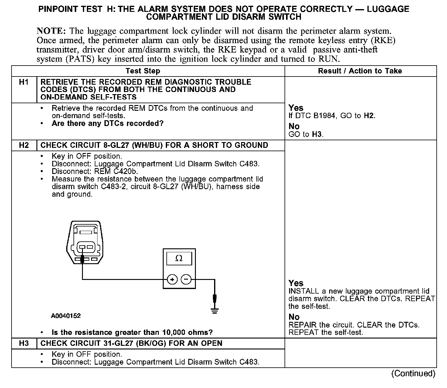 PINPOINT TEST H: THE ALARM SYSTEM DOES NOT OPERATE CORRECTLY - LUGGAGE COMPARTMENT LID DISARM SWITCHH1-H3: