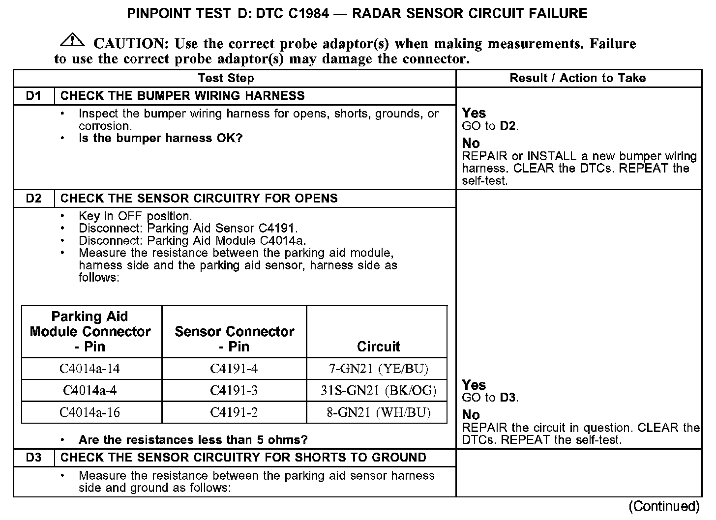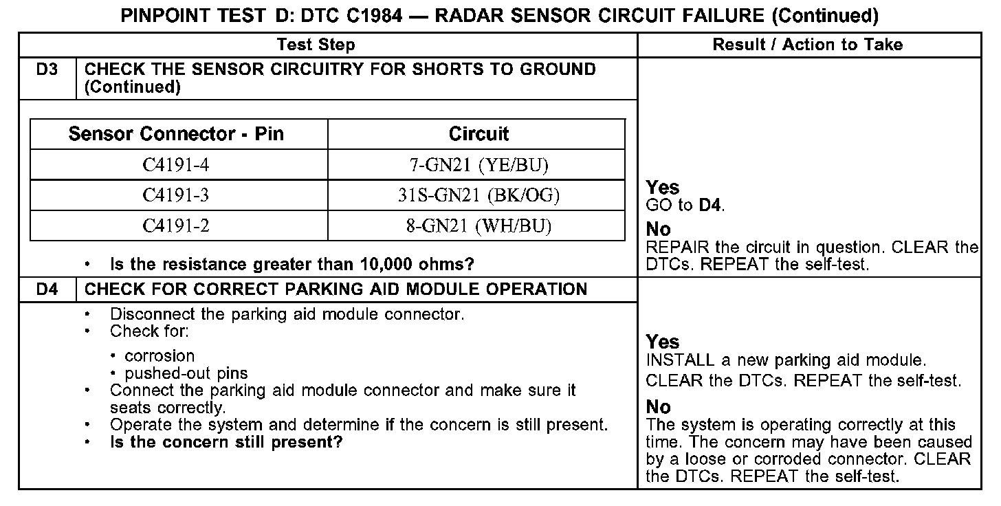 PINPOINT TEST D: DTC C1984 - RADAR SENSOR CIRCUIT FAILURED1-D3:
