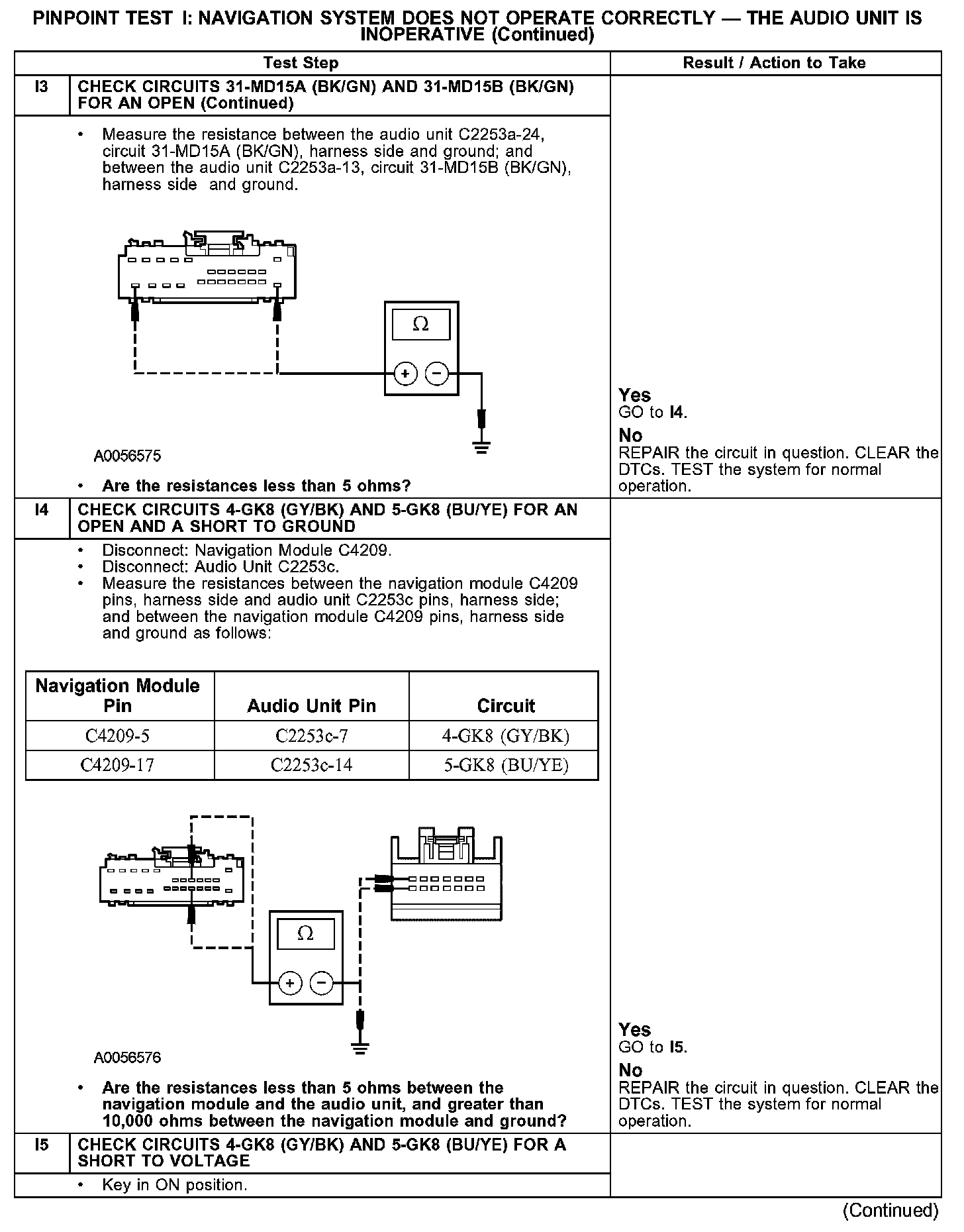 The navigation module communicates to the audio unit through circuits 5-GK8 (BU/YE) and 4-GK8 (GY/BK) using the controller area network (CAN) protocol. Battery voltage is supplied to the audio unit through circuit 29-MD15 (OG/BK). Circuit 10-MD15 (GY/OG) provides voltage to the audio unit with the key in the ON or ACC position. The audio unit ground is supplied through circuits 31-MD15B (BK/GN) and 31-MD15A (BK/GN).
