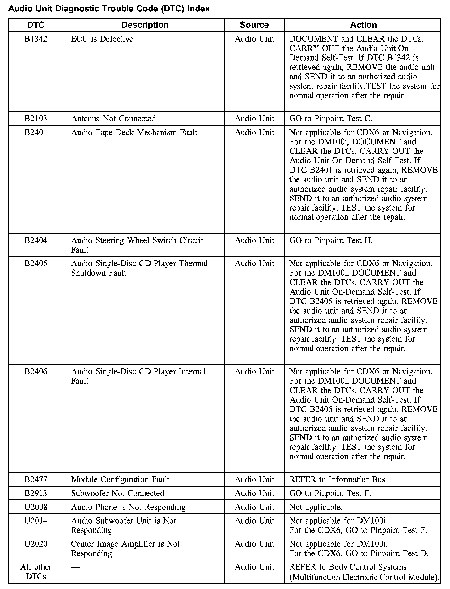 Audio Unit Diagnostic Trouble Code (DTC) Index
