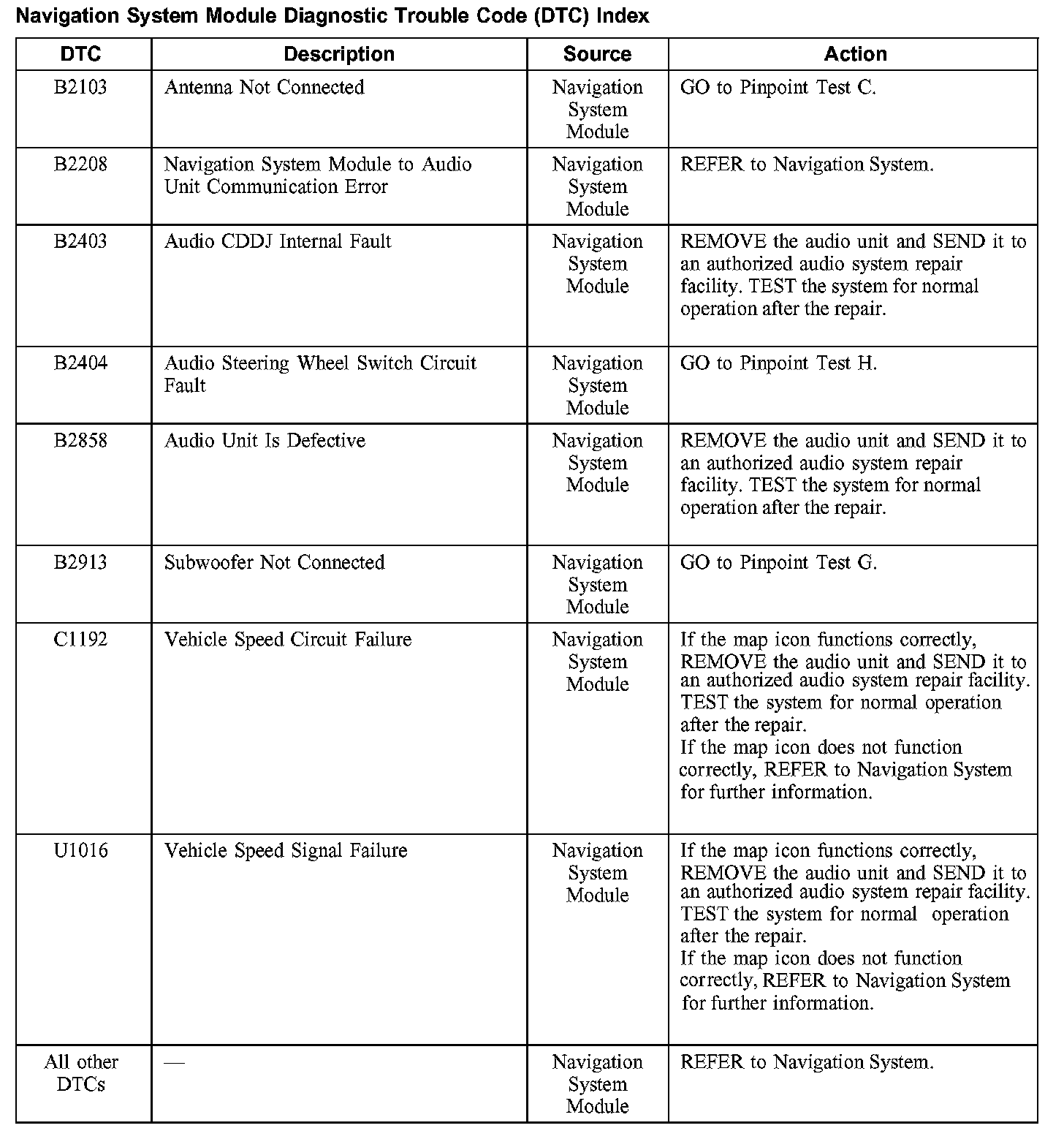 Navigation System Module Diagnostic Trouble Code (DTC) Index