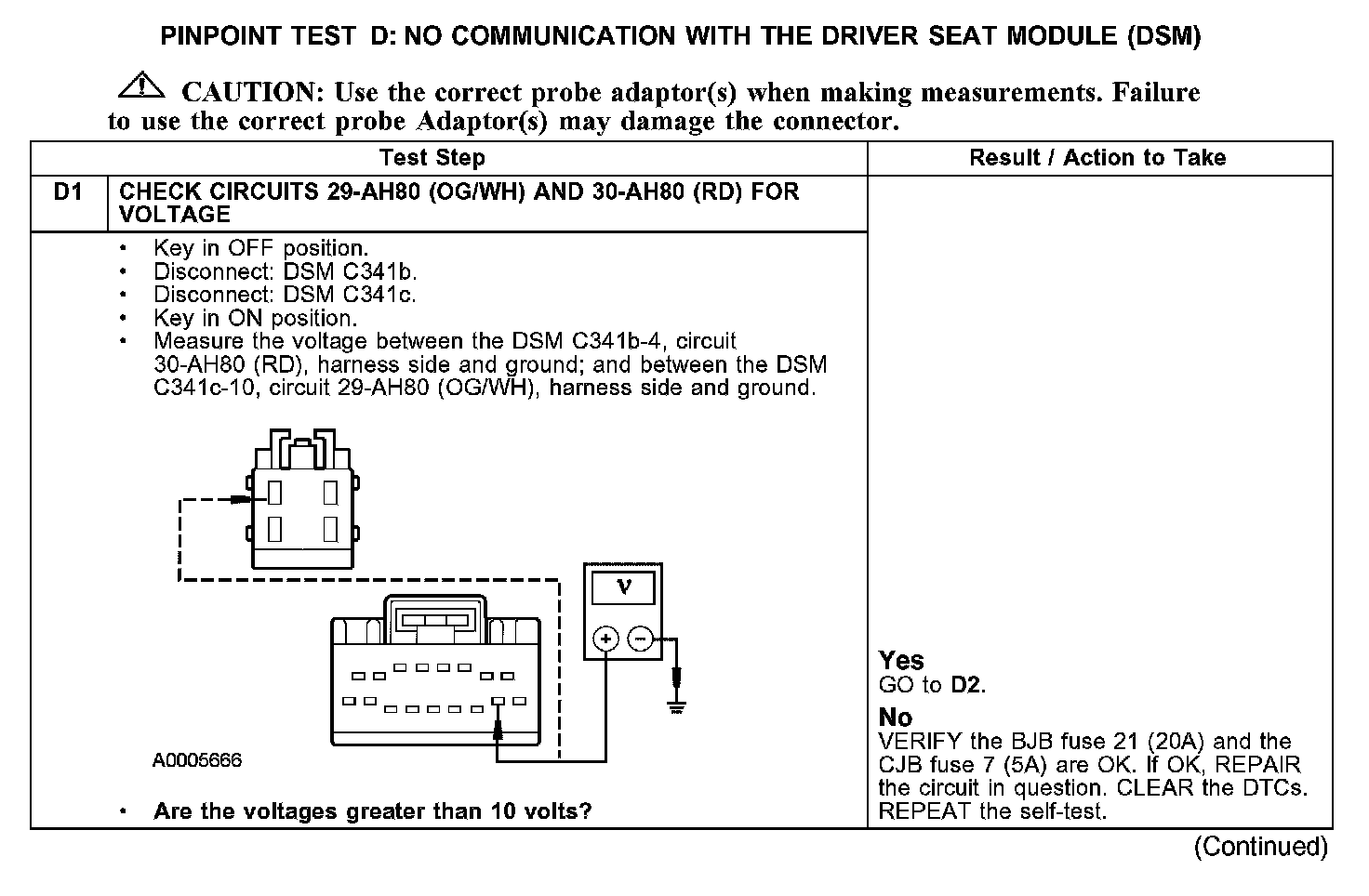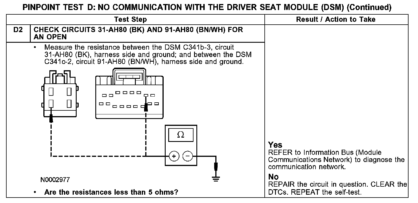 PINPOINT TEST D: NO COMMUNICATION WITH THE DRIVER SEAT MODULE (DSM)D1: