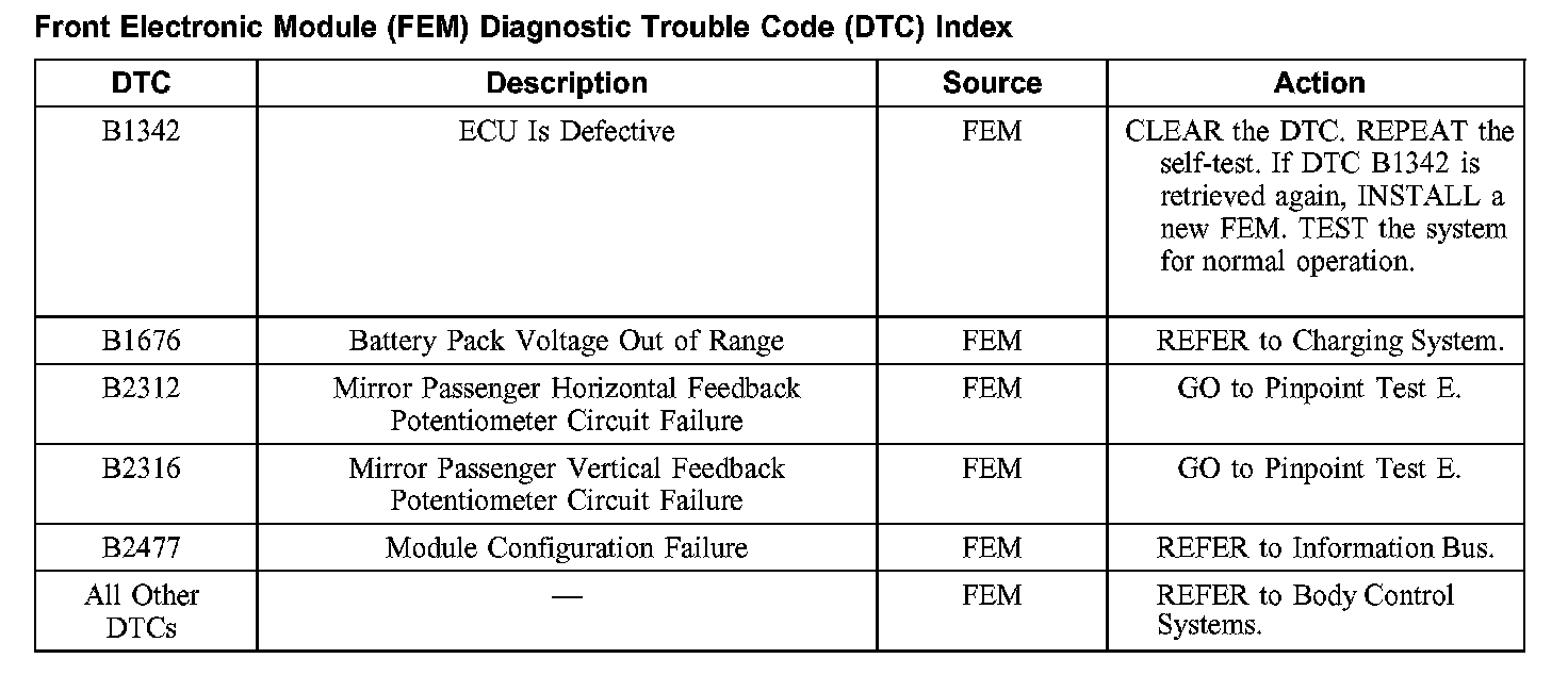 Front Electronic Module (FEM) Diagnostic Trouble Code (DTC) Index